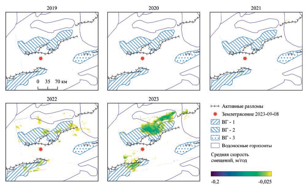 На рис. 2 представлены результаты оценок средних отрицательных скоростей смещений за год изменявшихся в пределах от –2.5 до –20 см, полученным по годичным данным за период времени с 2019 г. по 2022 г. и за 8 месяцев 2023 г. Цвета контуров водоносных горизонтов показаны синими линиями, аналогично таковым, показанным на рис. 1. Чёрными линиями с засечками на рис. 2 показаны активные разломы [13]. Эти и другие результаты в соответствие с современными тенденциями представлены на веб-странице [15], где с использованием ГИС технологий можно более наглядно ознакомиться с различными комбинациями информационных слоёв.