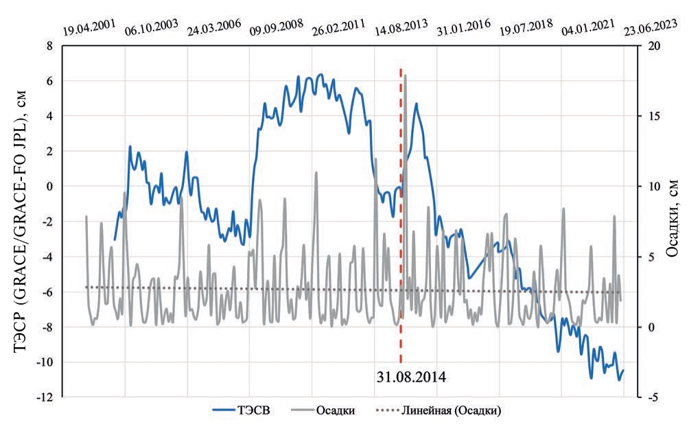 Анализ рис. 3 показал, что после достижения максимальных значений ТЭСВ, составляющих +6 см в 2010–2011 гг., отмечалось резкое снижение ТЭСВ до величины -1 в начале октября 2013 г. Это значение, с незначительными изменениями, сохранялось до даты землетрясения с магнитудой Mw = 4.8, происходившего в этом районе 31 августа 2014 г. (см. вертикальный красный пунктир на рис. 3). Далее отмечался локальный максимум ТЭСВ, достигавший +4.7 см в апреле 2015 г., связанный с предшествующим максимумом осадков. После чего ТЭСВ уменьшалась до –11 см, т.е. на величину порядка 15–16 см (см. рис. 3). В тоже время данные по осадкам (серая кривая на рис. 3) демонстрировали относительную сезонную стабильность на долговременных периодах с 2002 по 2023 гг.