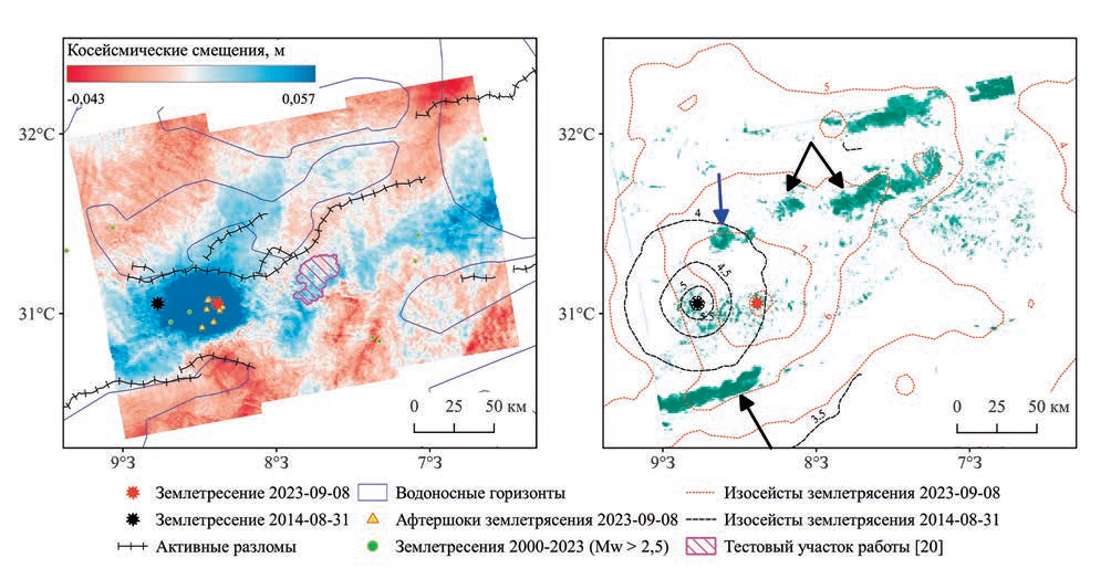 - За период времени с 2015 по 2023 гг. толщина эффективного слоя воды для фрагмента земной поверхности размером 1×1 градус, соответствующего области радиолокационных измерений, уменьшилась на 15–16 см (см. рис. 3). Вместе с тем в период резкого понижения ТЭСВ в 2013–2014 гг., в этом же районе 31 августа 2014 г. произошло землетрясение с магнитудой Mw = 4.8 (см. вертикальный пунктир красного цвета на рис. 3). Эпицентр этого сейсмического события 2014 г. (обозначен звёздочкой чёрного цвета на рис. 4 а) располагался на периферии зоны косейсмического поднятия , произошедшего в результате землетрясения 8 сентября 2023 г. с магнитудой Mw = 6.8 (эпицентр обозначен звёздочкой красного цвета на рис. 4 а), и афтершоков, показанных треугольниками жёлтого цвета на рис. 4 а. В этой области сейсмические события с магнитудами Mw ≥4.5 за период времени с 2014 по2023 годы. не регистрировались, а эпицентры сейсмичности с магнитудами более 2.5 показаны кружками зелёного цвета на рис. 4 а.
