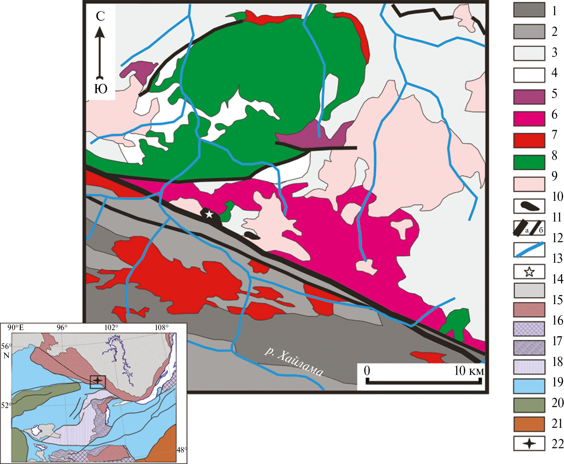 Рис. 1. Схема размещения Зашихинского месторождения в верховьях р. Хайламы, Восточный Саян по данным [8]. На врезке показано положение района в структурах юго-западного складчатого обрамления Сибирской платформы. 1 — алыгжерская свита: гнейсы биотитовые, гранат-биотитовые, амфиболовые, двупироксеновые, плагиогнейсы и кристаллосланцы в переслаивании, прослои и линзы белых мраморов графитизированных, кварцитов слюдистых; 2 — дербинская свита: мраморы графитистые, сланцы амфиболит-биотит-плагиоклазовые в переслаивании с плагиогнейсами, мраморами, кварцитами, прослои кварцитов, кальцифиров; 3 — алхадырская свита: сланцы, гнейсы биотитовые с прослоями мраморов доломитовых, гранат-двуслюдяные, гранат мусковитовые с дистенном, силлиманитом, амфиболиты, кварциты, кальцифиры, в основании – мраморы; 4 — нерасчлененные образования: сланцы и микрогнейсы биотитовые, амфиболовые, биотит-кварц-плагиоклазовые, гранат-слюдистые, альбит-кварц биотитовы, кварциты; 5 — хадаминский (китойский) комплекс мигматит-гранитовый: мигматит-граниты, гнейсоплагиограниты, гнейсотоналиты, гнейсограниты, жилы пегматитов; 6 — саянский комплекс гранодиорит-гранитовый первая фаза гранодиориты, плагиограниты, диориты; 7 — дербинский комплекс диорит-гранитовый: гранит биотитовые, амфибол-биотитовые, гнейсо-граниты, пегматитовые граниты, плагиограниты, диориты; дайки и жилы пегматитов; 8 — урдаокинский комплекс метапередотит-метагаббро: метагабброиды, ортоамфиболиты, габбро-амфиболиты, метагаббродолериты, метагаббродиориты, метадиориты, метапироксениты, метапередотиты, метагаббро-метапередотиты расслоенных мелких тел; 9 — огнитский комплекс сиенит-граносиенит-гранитовый: граносиениты, граниты, граниты эгирин-рибекитовые, нордмаркиты, сиениты, кварцевые сиениты, габбро, габбродиориты, диориты, дайки риолитов, гранит-порфиров, сиенит-порфиров, граносиенит-порфиров, пегматитовых гранитов, долеритовых порфиритов, долеритов; 10 — хайламинский комплекс щелочных гранитов и апогранитов: граниты лейкократовые, биотит-рибекитовые, биотитовые, рибекит-эгириновые, арфедсонитовые, апограниты альбит-микроклиновые с литиевыми слюдами, альбититы колумбитоносные, эруптивные брекчии топазовые, грейзены мусковит-протолитионитовые; 11 — разломы: а — большой Саянский разлом, б — прочие; 12 — реки и ручьи; 13 — Зашихинское месторождение; 14–21 — условные к врезке: 14 — чехол Сибирского кратона; 15 — кратонные блоки, 16‒18 — комплексы пород неопротерозойских террейнов: 16 — переработанные в позднем палеозое, 17 — вулканические, 18 — карбонатно-терригенные; 19–21 — складчатые структуры: 19 — раннепалеозойские, 20 — среднепалеозойские, 21 — позднепалеозойские; 22 — положение Зашихинского месторождения.