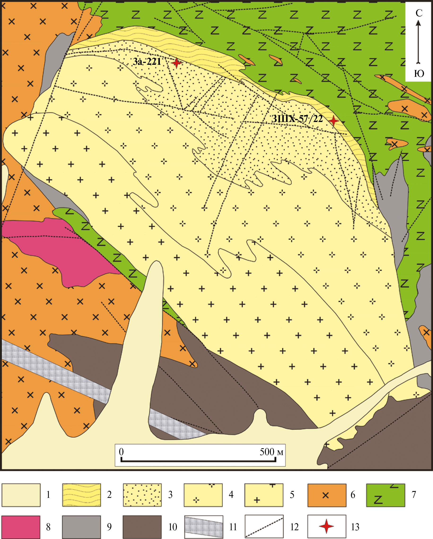 Рис. 2. Схема геологического строения Зашихинского месторождения по данным [2] с дополнениями авторов. 1 — четвертичные отложения; 2–5 — хайламинский комплекс: 2 — рудные альбититы; 3 — лейкократовые граниты с горошковидным кварцем; 4 — протолитионит-рибекит-арфведсонитовые граниты с эгирином; 5 — щелочные рибекитовые граниты, гранит-порфиры; 6 — среднепалеозойский огнитский комплекс: граниты биотитовые, сиениты, граносиениты; 7 — нижнепалеозойский хойто-окинский комплекс: диориты, гранодиориты амфибол-биотитовые; граносиениты; 8 – среднепротерозойский саянский комплекс: граниты крупнозернистые, порфировидные; 9–10 — раннепротерозойские отложения: 9 — мезократовые биотит-амфиболовые кристаллические сланцы; 10 — метасоматические кварциты; 11 — шовная зона Гланого Саянского глубинного разлома; 12 — разломы; 13 — места отбора проб.