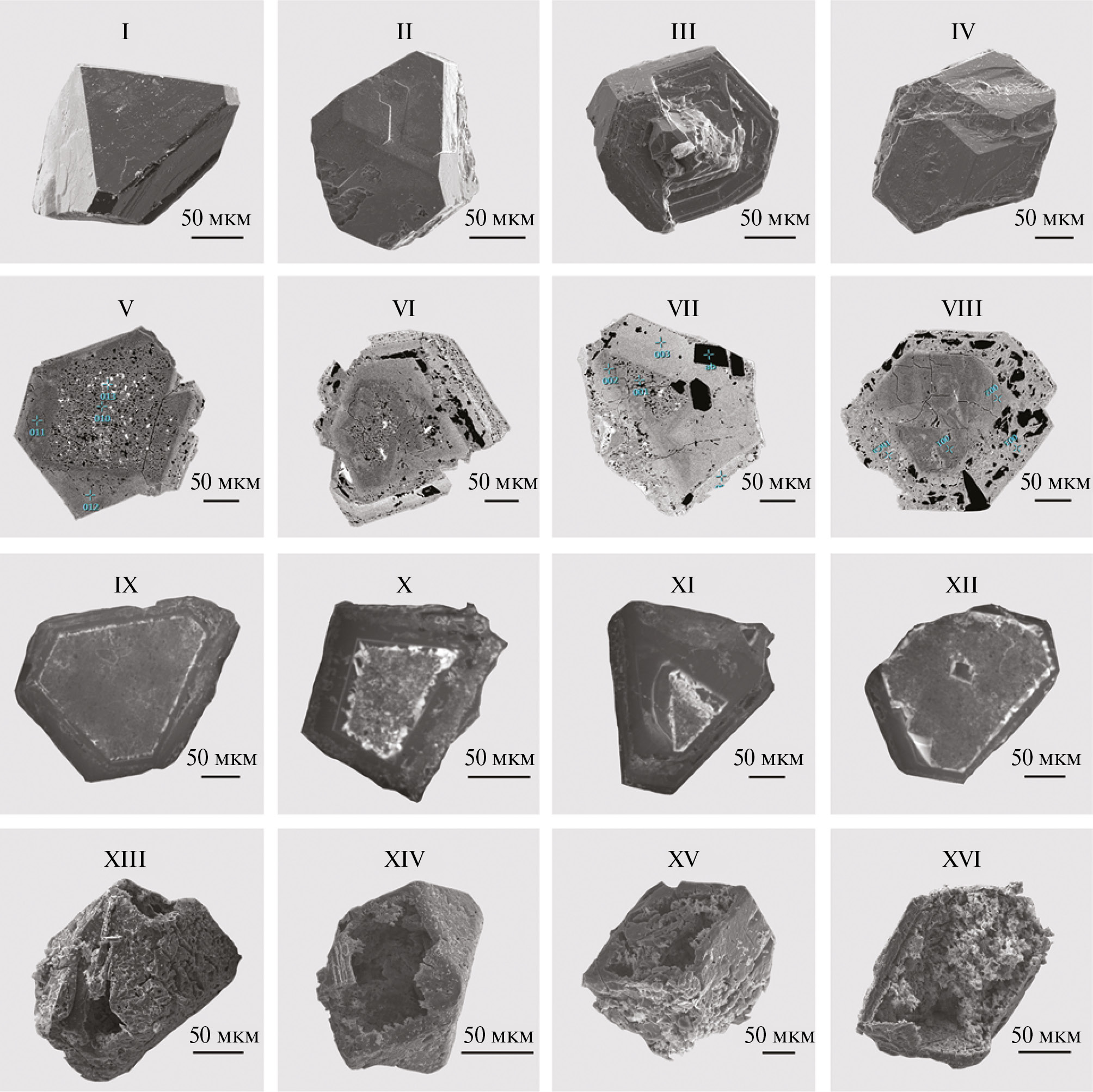 Рис. 4. Микрофотографии кристаллов циркона из альбитита (проба ЗШХ-57/22), выполненные в режимах вторичных электронов (I–IV, XIII–XVI), обратноотражённых электронов (V–VIII) и катодолюминесценции (IX–XII). XIII–XVI — кристаллы циркона кристаллов футляровидной формы после отжига при 850°C и кислотной обработки при 220°C в течение 4 ч.