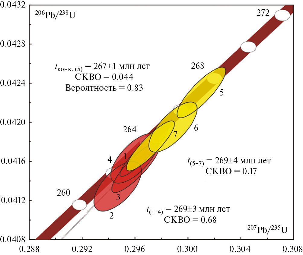 U–Pb-геохронологические исследования выполнены для трёх микронавесок (10–20 кристаллов) предварительно обработанного циркона, который характеризуется низким содержанием примесного “обыкновенного” свинца и незначительной (0.3–4.0 %) дискордантностью U/Pb-отношений (табл. 1, рис. 5). Точки изотопного состава циркона образуют дискордию, верхнее пересечение которой с конкордией соответствует 269±4 млн лет (СКВО = 0.17), нижнее пересечение близко к нулю. Конкордантная оценка возраста циркона (№ 5) составляет 267±1 млн лет (СКВО = 0.044, вероятность = 0.83).