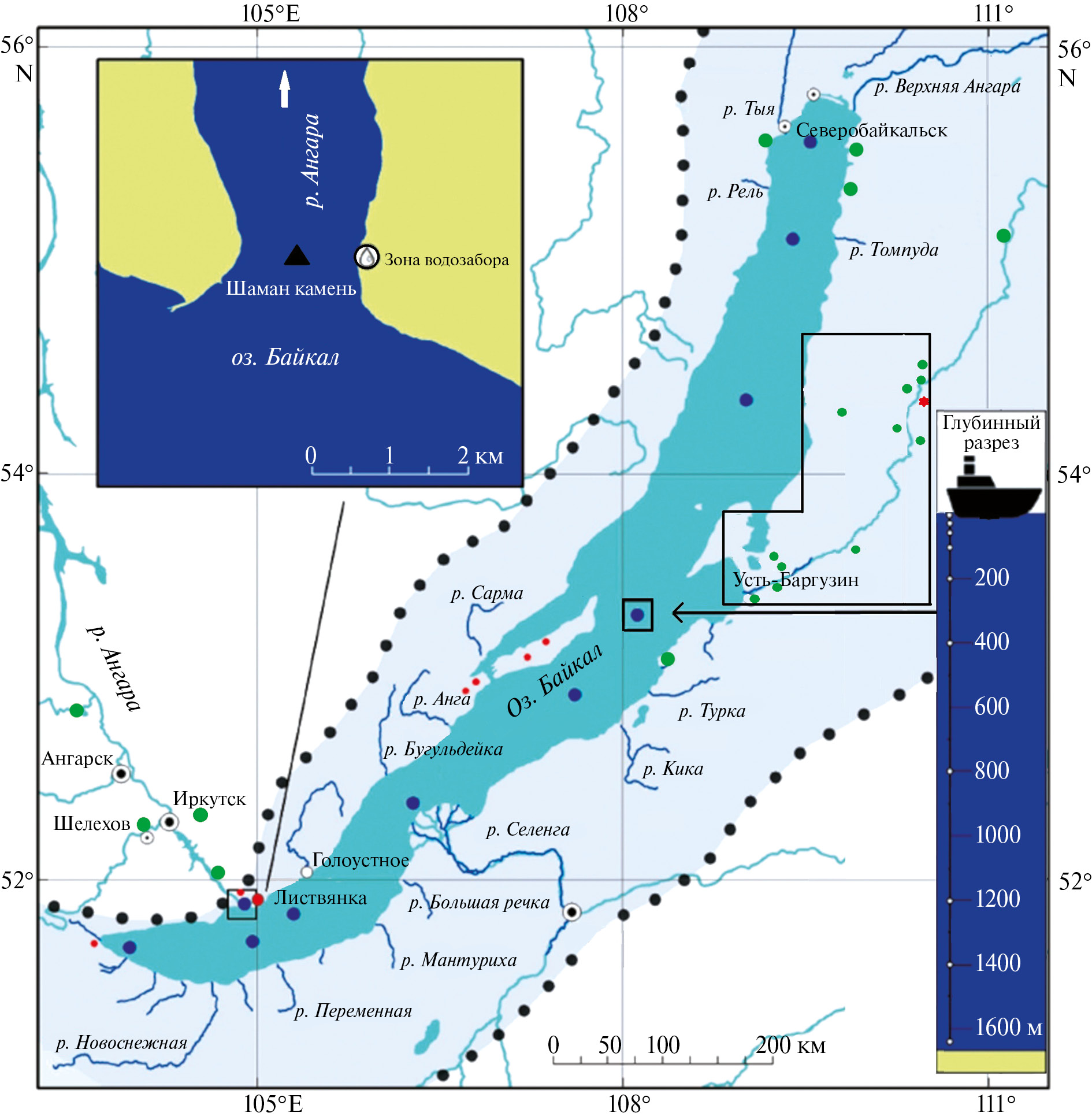 Байкал представлен тремя разноглубинными котловинами. Максимальная глубина отмечена в центральной впадине (1642 м). Вода вдоль берегов и в каждой котловине движется против часовой стрелки, отмечается подъём глубинной воды в пелагиальной зоне Байкала и опускание поверхностной воды в литоральных зонах (апвеллинг/даунвеллинг) [8]. За счёт последнего процесса происходит постоянное перемешивание и обновление воды Байкала. Кроме этого, предполагается возможное поступление глубинной воды при землетрясениях и геодинамических подвижках [9, 10], что также способствует постоянному обновлению воды Байкала.