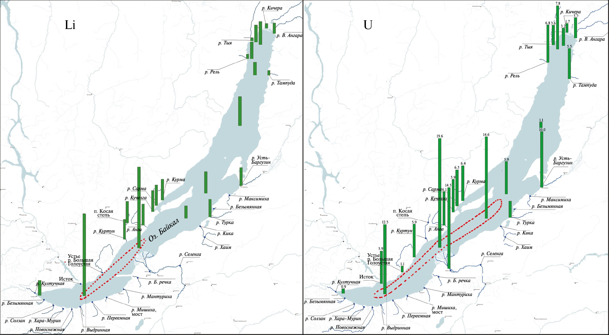 Рис. 3. Распределение лития (мкг/л) и урана (мкг/л) в поверхностной воде Байкала и в устьях притоков весной 2020 г. Красным пунктиром выделены повышенные содержания элементов в байкальской воде (пояснения в тексте).