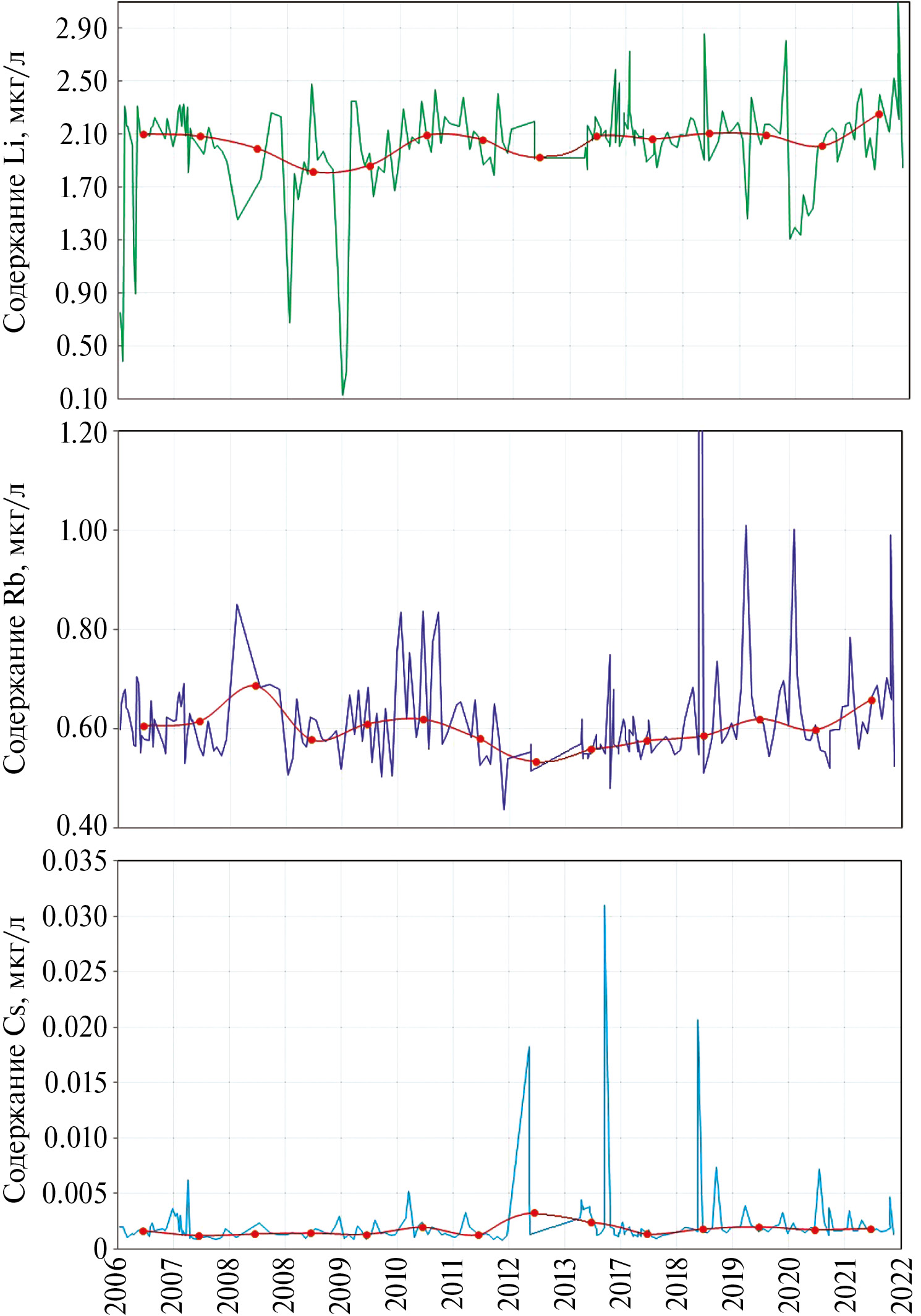 Рис. 5. Распределение ежемесячных концентраций Li, Rb, Cs в воде истока р. Ангары в 2006–2022 гг. Красные точки — годовые медианные значения элементов. В 2014–2016 гг. — перерыв в опробовании.