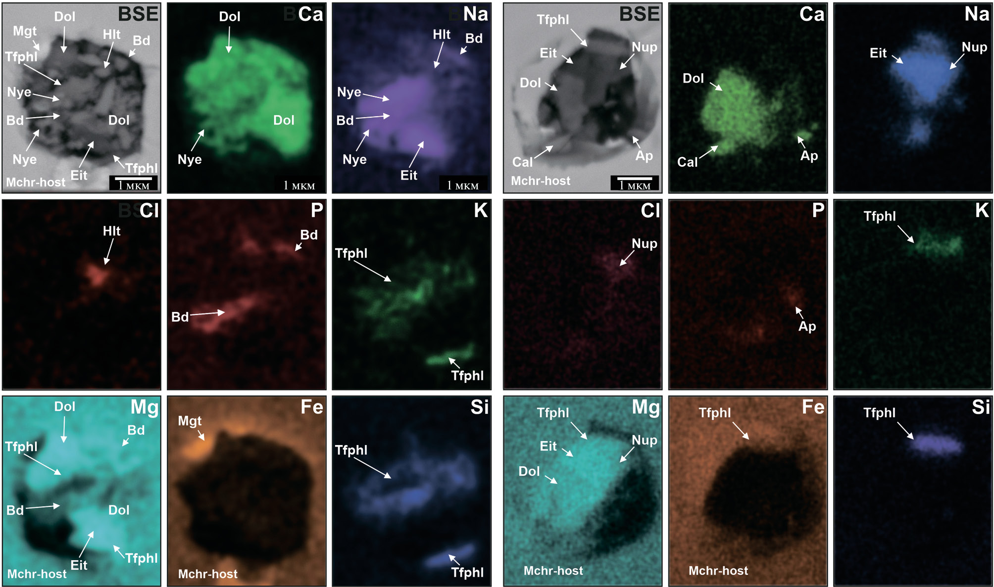 В породообразующем оливине ксенолита G1-25 ранее были изучены вторичные расплавные включения, которые, аналогично включениям в магнезиохромите, расположены в залеченных трещинах, маркированных эпигенетическим оливином [7]. Формирование включений в оливине происходило менее чем за 1 год до или сразу после попадания ксенолита G1-25 в кимберлитовую магму [7]. Таким образом, можно предполагать, что включения в оливине и магнезиохромите сформировались в ходе одного и того же процесса и являются реликтами одного и того же кимберлитового расплава. В целом, минеральные ассоциации вторичных расплавных включений в магензиохромите и оливине (табл. 2) можно назвать подобными, также как и соотношения Ca:Na:K (в оливине это соотношение составляет 1.2:1:0.2 в ат. % [7]), но есть некоторые различия.