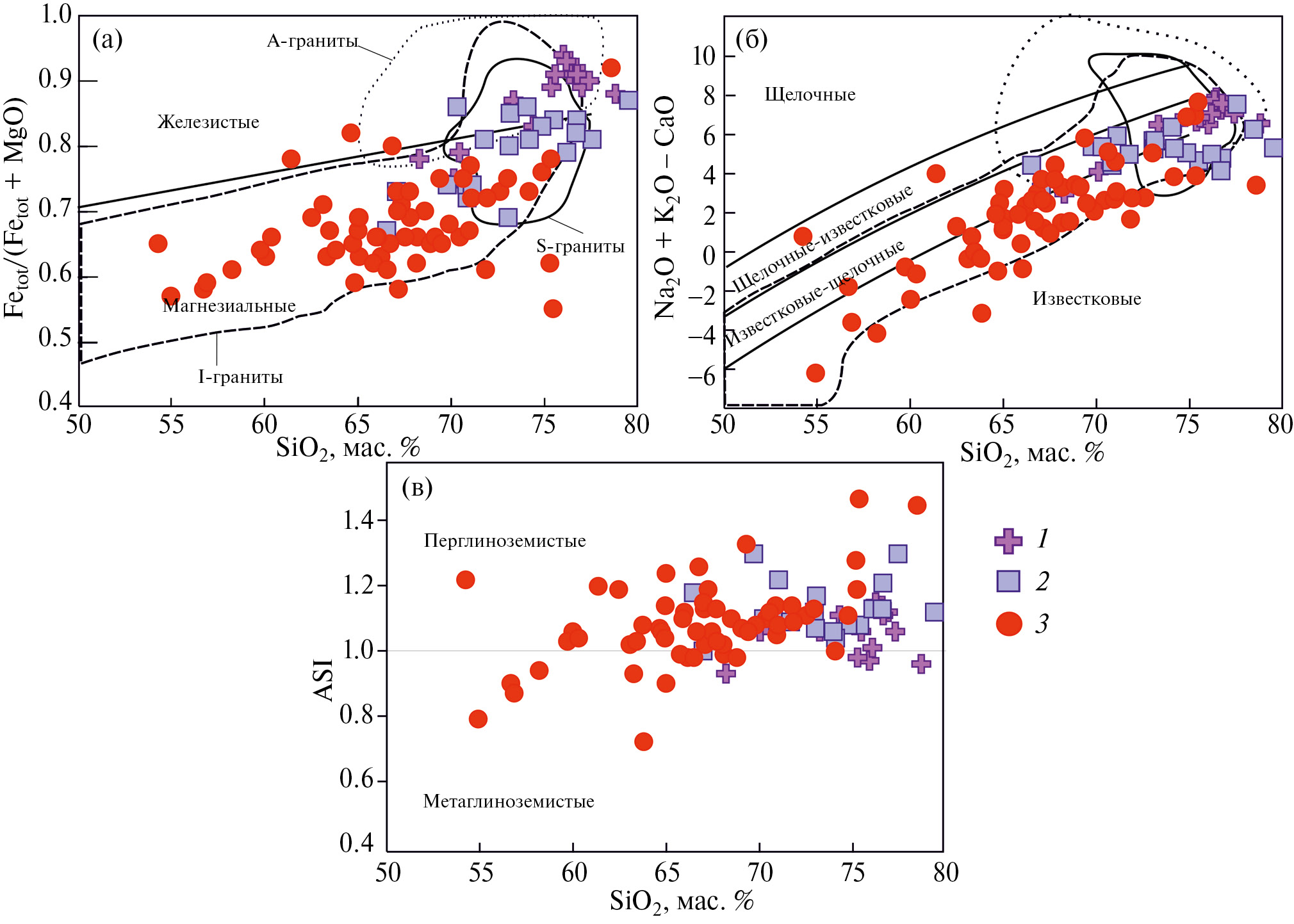 Рис. 3. Диаграммы FeOtot/(FeOtot+MgO)–SiO2 (а), Na2O+K2O–CaO–SiO2 (б), ASI–SiO2 (в) для гранитоидов саханьинского, омчикандинского иарга-эмнекенского комплексов. 1–3 — гранитоиды: 1 — саханьинского, 2 — омчикандинского, 3 — арга-эмнекенского комплексов.