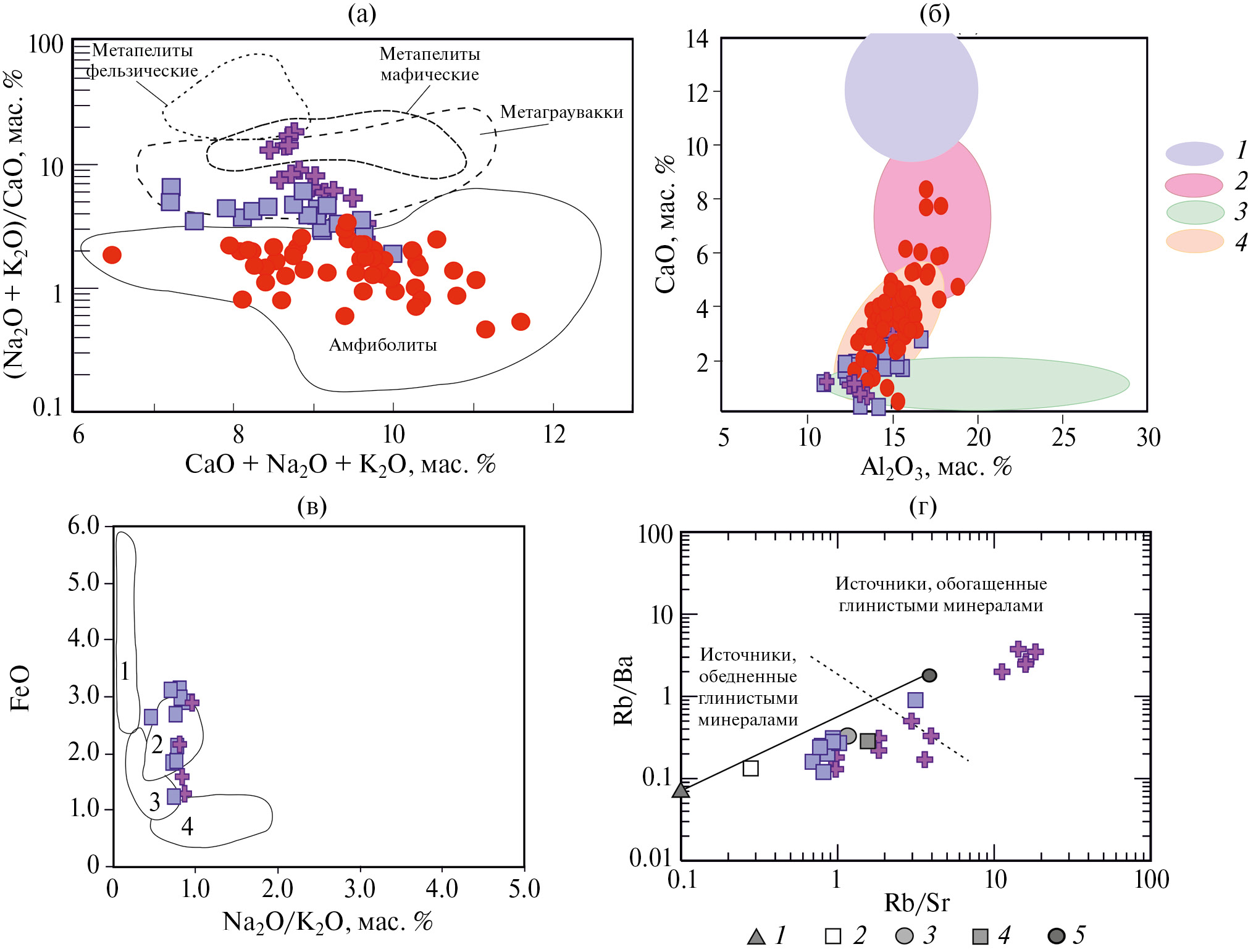 Рис. 7. Диаграммы (Na2O+K2O)/CaO–CaO+Na2O+K2O мас. % (а) [14], CaO–Al2O3(б) [20], FeO–(Na2O/K2O) мас. % (в) [20], Rb/Ba–Rb/Sr (г) [19]. б) источники гранитоидов: 1 — базальты, 2 — богатые щелочами мафические породы, 3 — метаосадки, 4 — метамагматические породы; в) 1, 2 — поля экспериментальных продуктов водонасыщенного плавления: 1 — метапелитов, 2 — биотитовых гнейсов; 3, 4 — поля экспериментальных продуктов дегидратационного плавления: 3 — биотитовых гнейсов, 4 — биотит-мусковитовых гнейсов, г) Рассчитанные составы: 1 — базальта, 2 — граувакки, 3 — сланца; 4, 5 — составы расплава, полученные при плавлении: 4 — псаммитового источника, 5 — пелитового источника.
