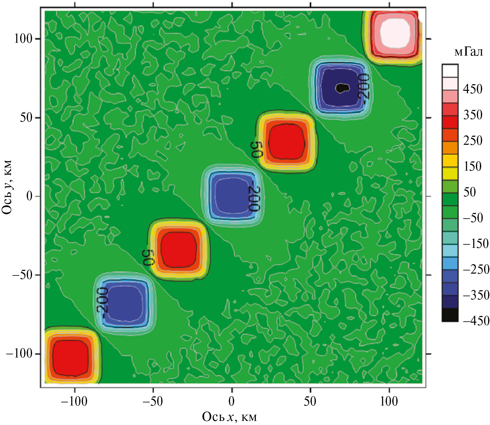 Предлагаемый в статье комбинированный подход к решению обратных линейных и нелинейных задач геофизики был апробирован на модельных и практических примерах. В модельном примере № 1 аномальное гравитационное поле создавалось набором из 10 прямых призм, нижние основания которых расположены на глубине 1 км под землёй, а высоты призм варьировались от 200 метров до 600 метров, а также 4 призм высотой 200 метров, нижние основания которых находились на глубине 3 км. Плотность породы в 6 верхних призмах полагалась равной 1.0 г/см3 и 0.5 г/см3 — в четырёх других; в нижних призмах плотность составила 1.0 г/см3. Участок съёмки имел размеры 100×100 км, рельеф местности выбирался спокойным, ровным (это означает, что перепад высот не превышал 250 метров). Пунктов наблюдения было 10 000 (т.е. вся выборка данных имела объем m = 10 000). Поперечники призм варьировались от 8 до 40 км. Поле призм аппроксимировалось суммой простого и двойного слоёв, распределённых на нескольких горизонтальных плоскостях (от 2 до 10), залегающих на глубинах от 100 метров до 500 м. Карта изолиний гравитационного поля призм приведена на рис. 1. Мы решили вариационную задачу (12) с помощью методики, описанной в [1] и нашли эквивалентные по внешнему гравитационному полю распределения масс на горизонтальных плоскостях для (b, v, r, k, λ)-конфигурации, в которой b = 10, k = 1 000, v = 20, r = 500, λ = 5. Поясним смысл параметров указанной конфигурации, которая соответствует примеру № 2 из первого раздела статьи.