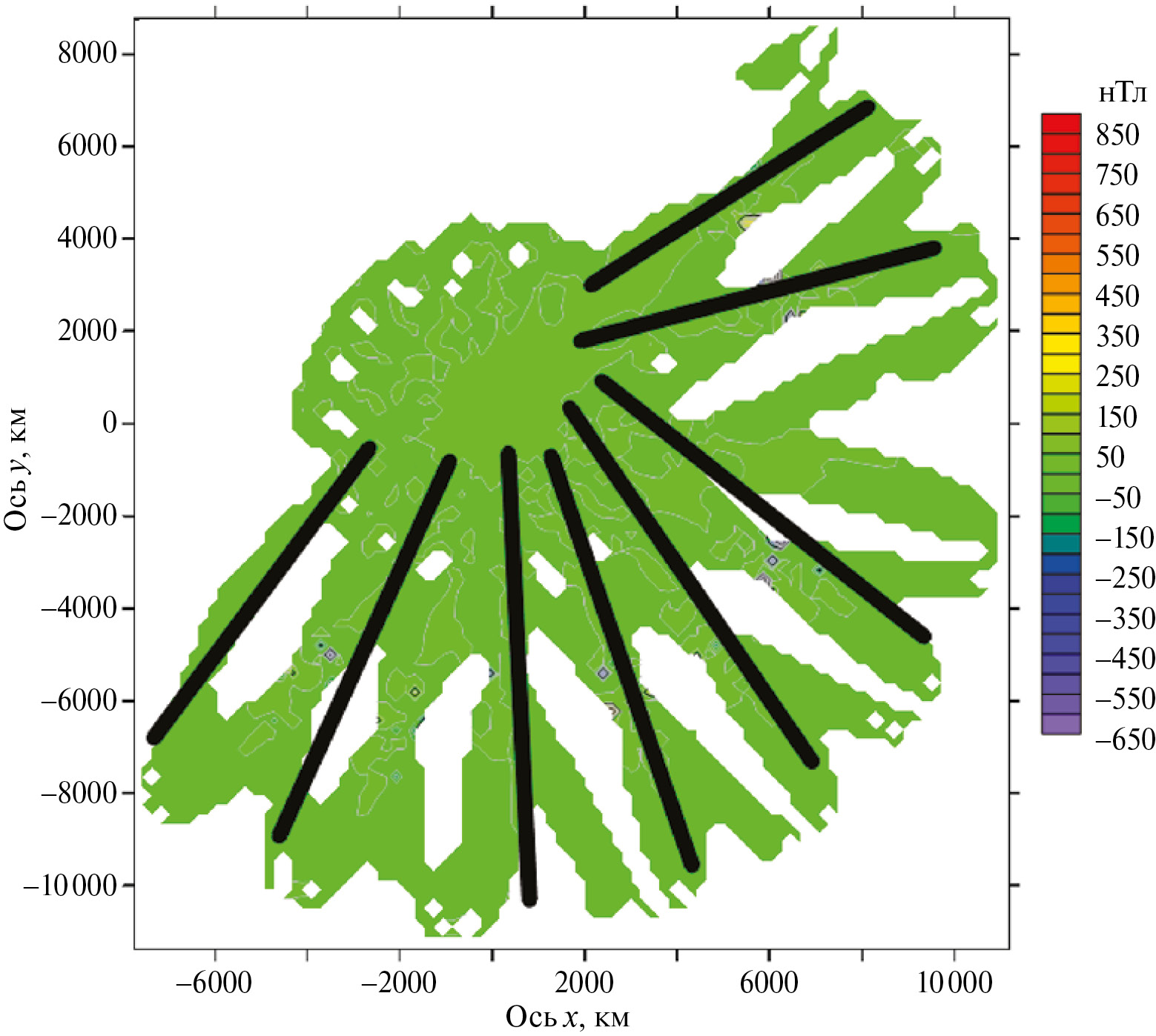 Весь набор данных по магнитному полю Меркурия рассматривался нами как некоторое дискретное множество. Это дискретное множество было затем представлено шестью различными комбинаторными конфигурациями (они соответствуют строкам табл. 1, начиная с самой верхней): 1-я конфигурация — это вся выборка; вторая конфигурация — это разбиение множества точек на три блока (см. формулу (2)) указанных в таблице размеров; третья конфигурация — это разбиение выборки на 4 блока по формуле (2); четвёртая — это конфигурация, получающаяся при группировании точек наблюдения по зонам, удалённым от Меркурия на расстояния 10, 50 и 100 км; пятая конфигурация — это точки, расположенные на расстоянии 50 км от поверхности Меркурия; шестая конфигурация — это группы точек, располагающиеся в семи секторах, биссектрисы которых изображены чёрным цветом на рис. 1.