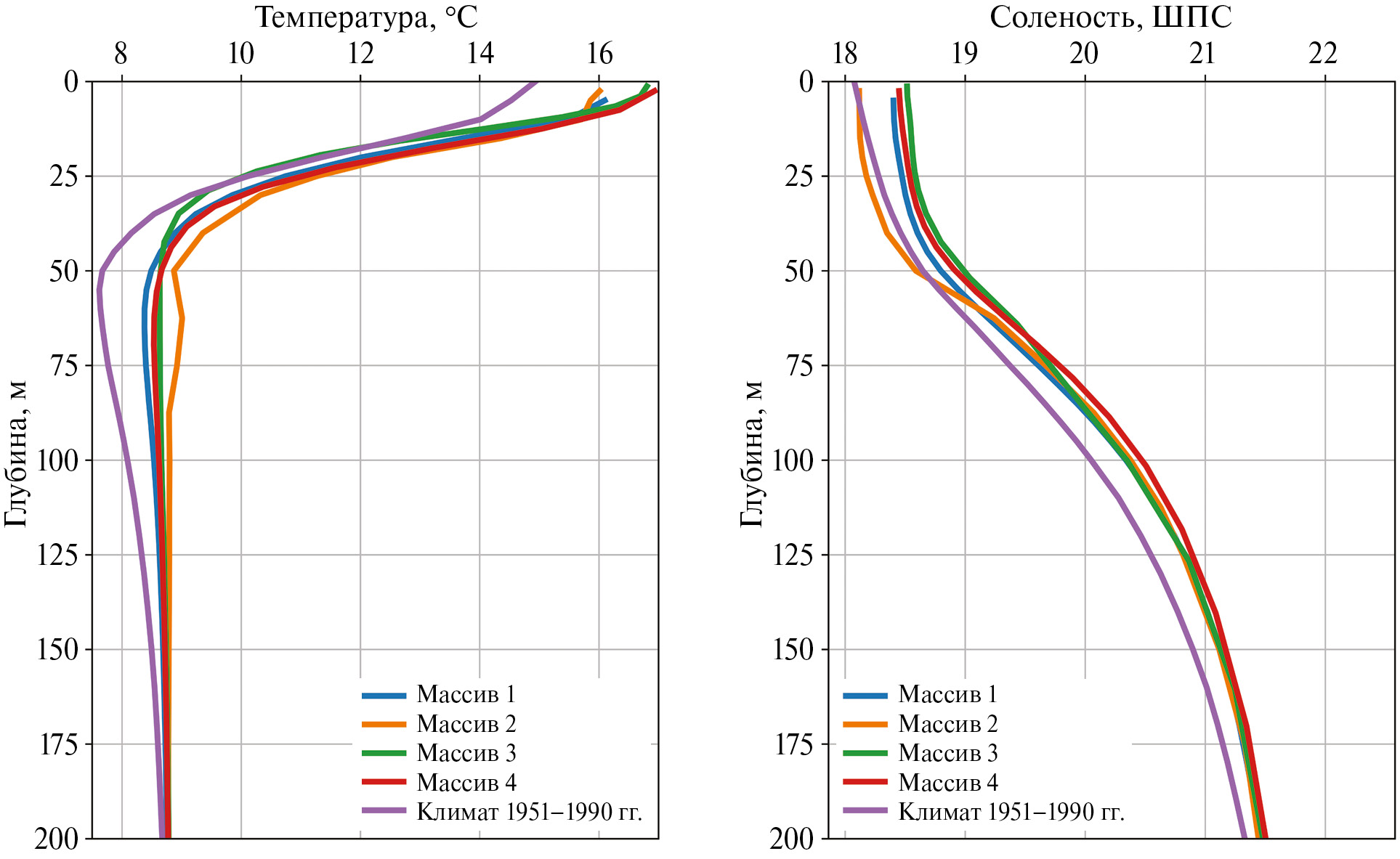 На рис. 1 представлены профили температуры и солёности морской воды, полученные осреднением на каждом горизонте и за период времени с 2019 по 2020 гг, для каждого из реанализов и по имеющимся наблюдениям. Для представления об общих тенденциях изменения состояния моря в последние годы, на рис. 1 приведены также построенные по данным наблюдений средние профили температуры и солёности морской воды за 1951–1990 годы. На рис. 1 по всем реанализам видно заметное потепление в слое 0–200 м в 2019–2020 гг. в сравнении с периодом 1951–1990 гг. В дальнейшем мы сконцентрируемся на анализе изменений, происходящих именно в этом слое в 2000–2020 годы.
