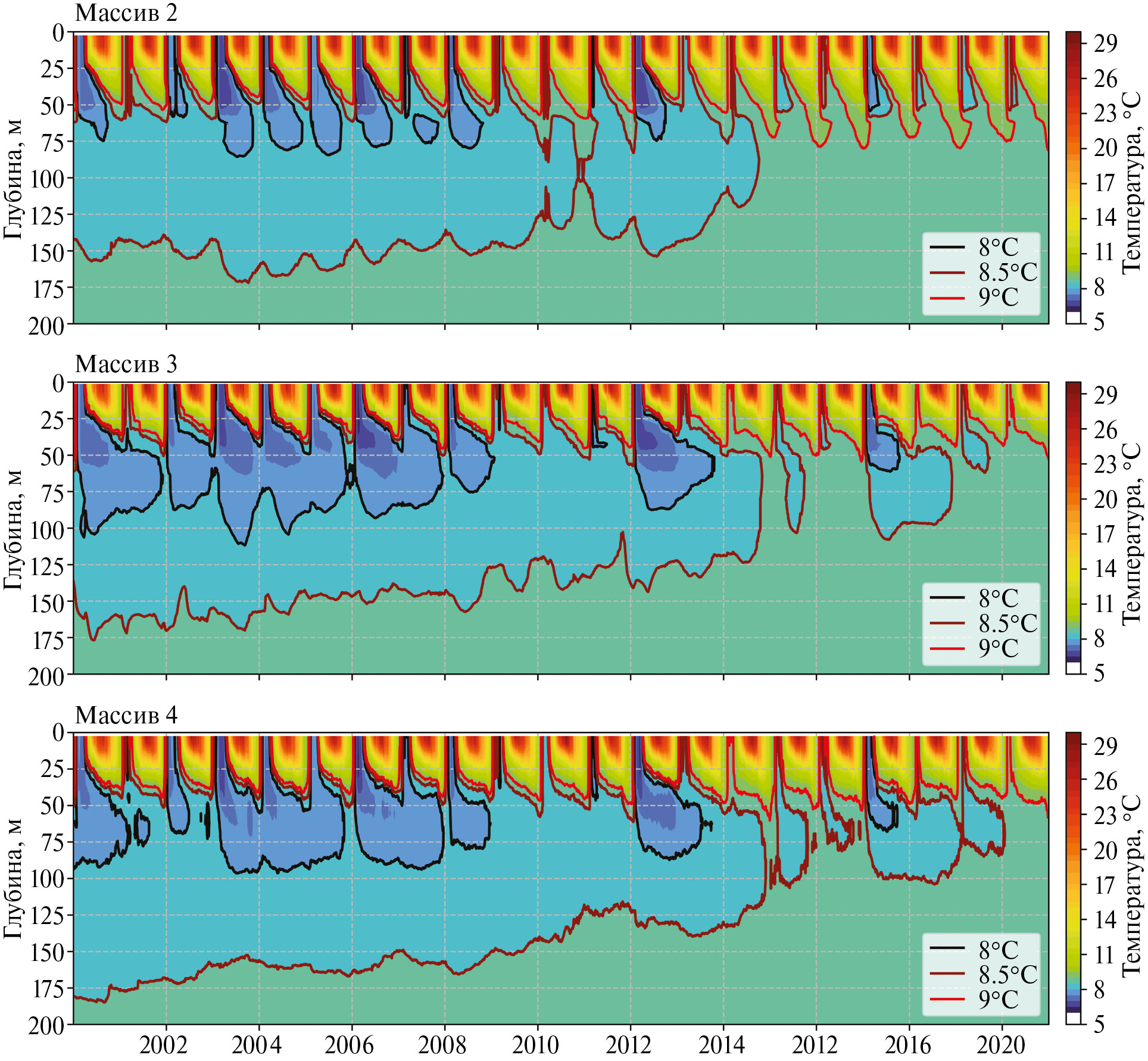 Эволюция ХПС хорошо видна на рис. 4, где представлена диаграмма изменений во времени средней по горизонтальным сечениям температуры морской воды в глубоководной (с глубинами более 500 м) части моря. Все реанализы показывают наличие в глубоководной части моря традиционного (т.е. вентилируемого во время зимней конвекции) ХПС, ограниченного изотермами 8°С, с небольшими перерывами, вплоть до конца 2008 года. В реанализе, представленном массивом 2 при этом интенсивность зимней конвекции ниже, чем в двух других реанализах, поэтому дальнейшие выводы основаны на данных близких между собой массивах 3 и 4.