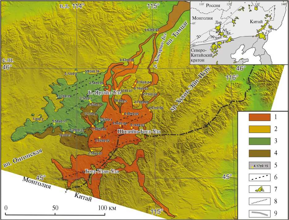 Рис. 1. Схема строения вулканического поля Дариганга на карте радарной топографической съемки (SRTM). 1–4 - вулканические комплексы: 1 - плейстоценовый, 2 - позднеплиоценовый, 3 - позднемиоцен–раннеплиоценовый, 4 - средне–позднемиоценовый; 5 - места отбора геохронологических проб и результаты датирования; 6 - линии простирания вулканических гряд (вулканических каналов). На врезке показаны позднекайнозойские вулканические поля Центральной и Восточной Азии: 7 - вулканические поля: Дар - Дариганга, Аб - Abaga, Дн - Dalinuoer; 8 - разломы по [17]: Дз - Дзунбаинский, Эр - Erenhot, Лин - Linxi; 9 - зона глубинного разлома, контролирующая систему вулканических полей Дариганга-Abaga-Dalinuoer