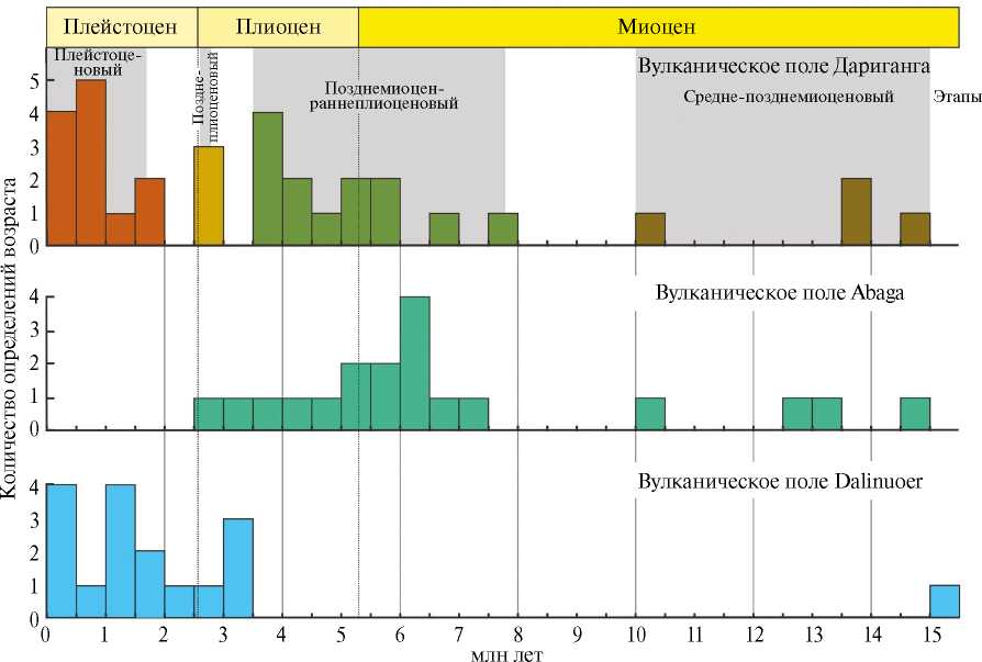 На рис. 2 приведено сопоставление геохронологических данных, полученных для пород ВПД, с аналогичными данными для пород соседних с ним (см. врезку к рис. 1) вулканических полей Abaga и Dalinuoer (по [12]). Это сопоставление выявляет как общие их особенности, так и определенные отличия. Прежде всего отметим, что формирование всех трёх полей началось около 15 млн лет назад, при этом среднемиоценовый вулканизм не оставил значительных следов в строении ни одного из них. Вулканическая активность позднего миоцена–плиоцена помимо северо-западной части ВПД проявилась в пределах поля Abaga, где был сформирован весь современный объём его лавового чехла. Образование поля Dalinuoer в основном протекало в позднем плиоцене и плейстоцене, когда в пределах поля Abaga наступило вулканическое затишье. Подобное формирование этих полей можно рассматривать как результат миграции в юго-восточном направлении центров вулканизма между ранним и поздним плиоценом. Эта особенность их образования чётко коррелирует с подобной же миграцией в формировании ВПД. Выявленное сходство позволяет предположить, что рассматриваемая система вулканических полей ВПД – Abaga–Dalinuoer, скорее всего, представляет след от воздействия на литосферу двух сближенных мантийных источников магматизма (мантийных плюмов по [16]) при смещении над ними литосферы в северо-западном направлении. Один из плюмов располагался в основании ВПД, а другой в основании сближенных полей Abaga–Dalinuoer. Можно предположить, что разные по расстоянию смещения центров вулканизма при их однонаправленности и согласованности во времени определялись условиями размещения выводящих каналов. Так, в ВПД как позднемиоцен–раннеплиоценовая, так позднеплиоцен–плейстоценовая системы выводящих каналов, хотя и разнесены на 20 км, но отвечают зоне влияния крупного Дзунбаинского разлома. В системе вулканических полей Abaga– Dalinuoer позднемиоцен–раннеплиоценовая активность поля Abaga контролировалась разломом Erenhot, а позднеплиоцен–плейстоценовая поля Dalinuoer – разломом Linxi [18] (врезка на рис. 1).
