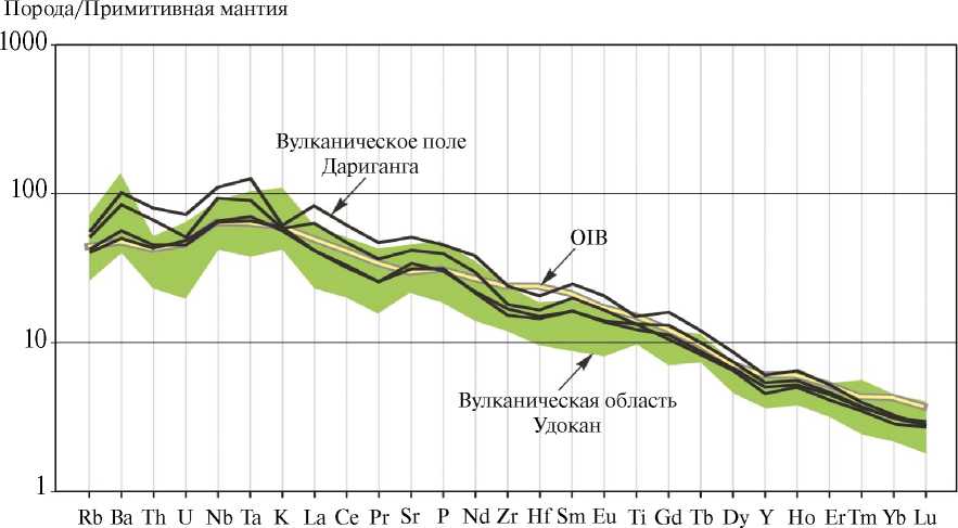 Рис. 3. Спектры распределения нормированных концентраций редких элементов в вулканических породах, максимально удалённых областей позднекайнозойской внутриплитной вулканической провинции Центральной и Восточной Азии – вулканического поля Дариганга (средние составы разновозрастных групп по нашим неопубликованным данным) и вулканической области Удокан (поле составов по [8]). Средний состав базальта океанических островов (OIB) и нормировка на состав примитивной мании по [13]