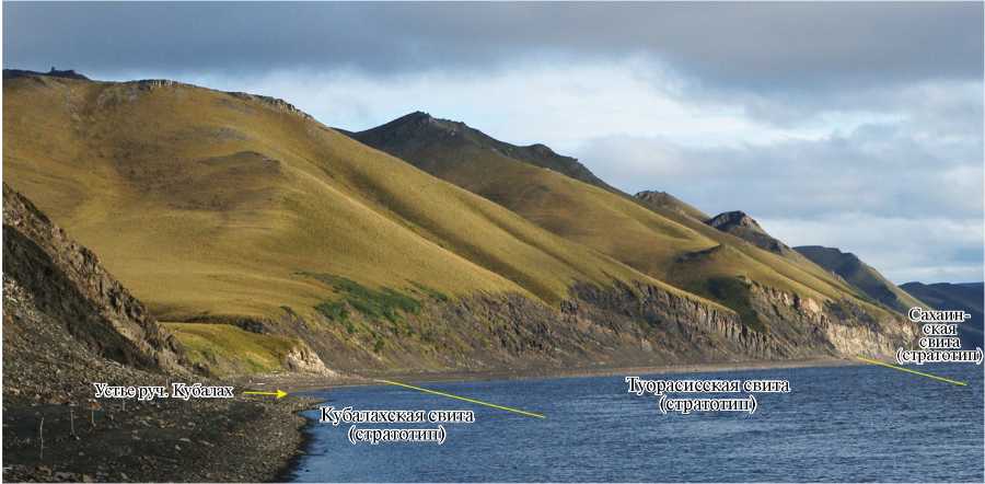 Кубалахский разрез расположен на правом берегу низовьев р. Лены в районе устья руч. Кубалах (рис. 1) и является стратотипическим для всех свит пермской системы Усть-Ленской структурно-фациальной зоны [8]. Здесь, в обнажении 10R2, начиная от устья руч. Кубалах вверх по р. Лены моноклинально залегают кубалахская (верхняя часть), туорасисская (в полном объёме) и сахаинская (нижняя часть) свиты (рис. 2). Первые два стратона охарактеризованы брахиоподами, последовательность которых позволила расчленить разрез на ряд биостратиграфических зон [9]. По появлению представителей пермского сообщества брахиопод граница карбона и перми в этом разрезе нами условно проводилась в основании слоя 2 [9]. Оставшаяся часть кубалахской свиты и туорасисская свита (за исключением пачки 5) относились к нерасчленённым ассельско-сакмарским отложениям. Нижняя часть сахаинской свиты отнесена к артинскому ярусу по иноцерамоподобным двустворкам [9]. В составе этого яруса мы также включаем пачку 5, по возрасту, вероятно, соответствующая слоям с Neoshumardites triceps hyperboreus Западного Верхоянья [10].