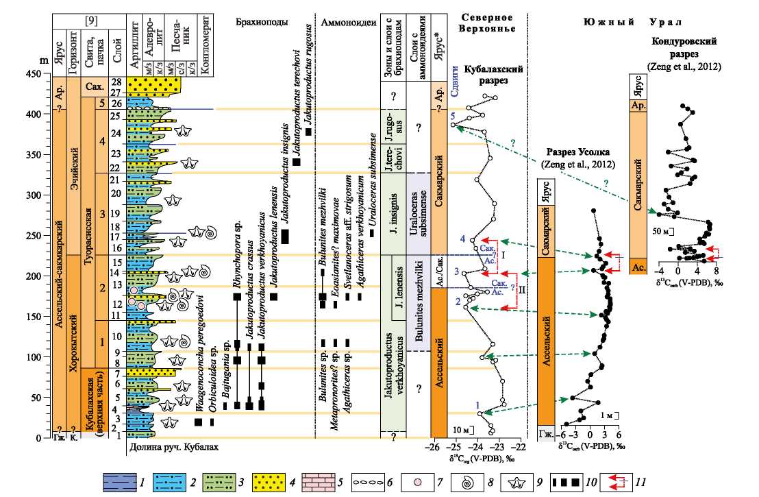 4. Рис. 3. Сопоставление изменения δ13Corg в ассельско-сакмарских отложениях Кубалахского разреза Северного Верхоянья с изотопно-углеродными трендами стратотипической местности приуральского отдела. Слева направо: Кубалахский разрез (обн. 10R2), распределение в нём брахиопод и аммоноидей, биостратиграфическое деление, изменение в разрезе изотопного состава углерода органического вещества и сопоставление с вариацией значений δ13Ccarb в ассельском и сакмарском ярусах Южного Урала: 1 - аргиллит, 2 - алевролит м/з, 3 - алевролит к/з, 4 - песчаник, 5 - известняк, 6 - конгломерат, 7 - конкреции, 8 - аммоноидеи, 9 - брахиоподы, 10 - находки беспозвоночных по количеству экземпляров: единицы, до десяти, более десяти, 11 - двойной отрицательный сдвиг значений δ13C, горизонтальный штрих указывает на положение ассельско-сакмарской границы, установленной по конодонтам [13]; I, II - два варианта фиксации двойного отрицательного сдвига значений δ13C в Кубалахском разрезе; Гж., Ас., Сак., Ар. - гжельский, ассельский, сакмарский и артинский ярусы, К. - кыгылтасский горизонт, Сах. - сахаинская свита; * с уточнением границ по изотопно-углеродным данным