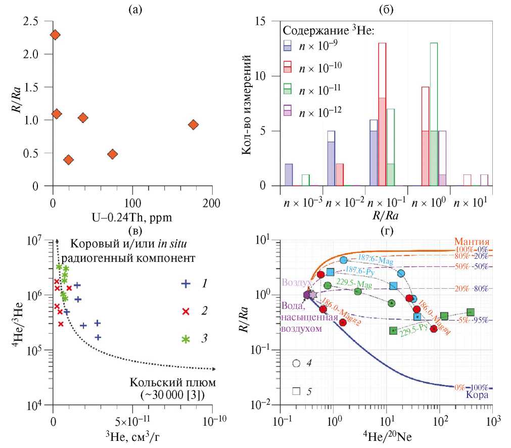 Рис. 1. (а) Сопоставление отношения R/Ra в валовом газе, извлечённом при дроблении, с содержанием U + 0.24Th (ppm), определённом в пудре, оставшейся после дробления. (б) Гистограмма, отражающая связь частоты встречаемости определённых значений отношения R/Ra в зависимости от содержания 3He для минералов и валовых проб карбонатитов (закрашенные области столбиков) и комплементарных им пород (пустые области) из комплексов КЩП по данным из работы [3]. Сопоставление (в) концентрации 3He с изотопным отношением 4He/3He и (г) отношений R/Ra и 4He/20Ne во флюидах, извлечённых ступенчатым дроблением из пирита и магнетита эксплозивных карбонатитовых брекчий массива Салланлатва. Условные обозначения: 1 — первая ступень дробления (до 100 ударов), 2 — вторая ступень (от 100 до 200 ударов), 3 — третья ступень дробления (от 200 до 1000 ударов), 4 — магнетит (Mag), 5 — пирит (Py). На рисунке (в) приведена линия смешения, построенная по данным из работы [8], между веществом Кольского плюма [3] и радиогенным гелием, образованным в минерале in situ. На рисунке (г) цвет символов соответствует исследованному образцу (красный — 186.0 м, голубой — 187.6 м, зелёный — 229.5 м), а стрелки отражают последовательность ступеней дробления от первой к третьей. На рисунке (г) также приведены линии смешения между водой, насыщенной воздухом, корой и верхней мантией ([1, 16] и ссылки там), а также изотопные характеристики воздуха атмосферы [17]