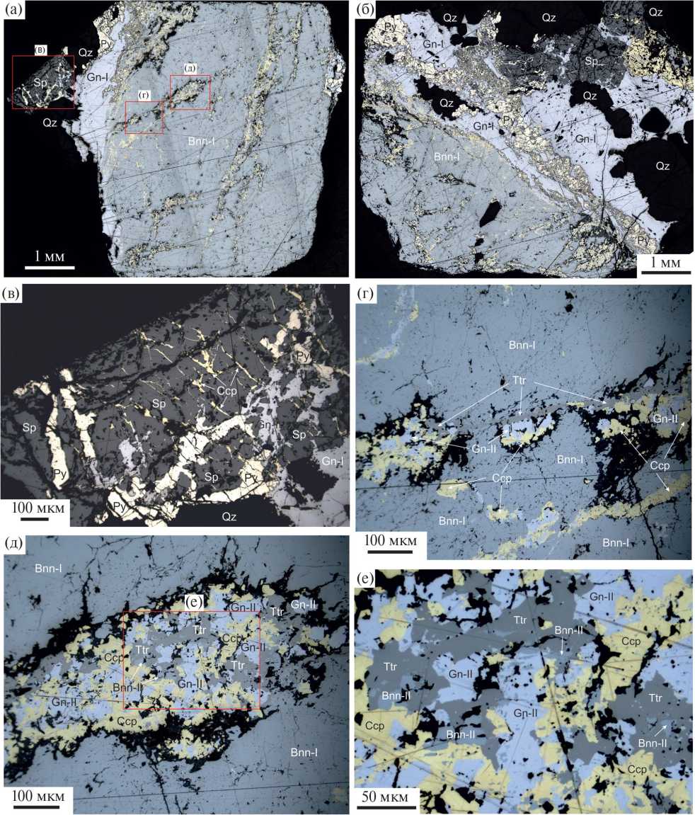Рис. 2. Срастания минералов в аншлифе из образца FMM_1_74896 (Кон-Дара, Таджикистан). (а, б) Срастание бурнонита-I (Bnn), галенита-I (Gn), сфалерита (Sp) и пирита (Py). Бурнонит-I сечётся полиминеральными прожилками; (в) Сфалерит содержит сеть прожилков (систему трещин), заполненных пиритом, галенитом-II и халькопиритом. Пирит слагает прожилки мощностью 20–60 мкм. Галенит-II развивается по прожилкам мощностью 10–50 мкм в сфалерите и внутри прожилков пирита, частично замещая его. Халькопирит выполняет прожилки мощностью менее 5 мкм, которые секут сфалерит и прожилки пирита; (г) Бурнонит-I содержит галенит-халькопиритовые (10–20 мкм) и мономинеральные тетраэдритовые (5–10 мкм) прожилки, в раздувах которых тесные ксеноморфные срастания галенита-II, халькопирита и тетраэдрита (Ttr); (д, е) Участок полиминерального прожилка с раздувом мощностью 300 мкм в бурноните-I и его увеличенный фрагмент. Тесные срастания галенита-II, халькопирита, тетраэдрита и бурнонита-II. Фотографии в отражённом свете