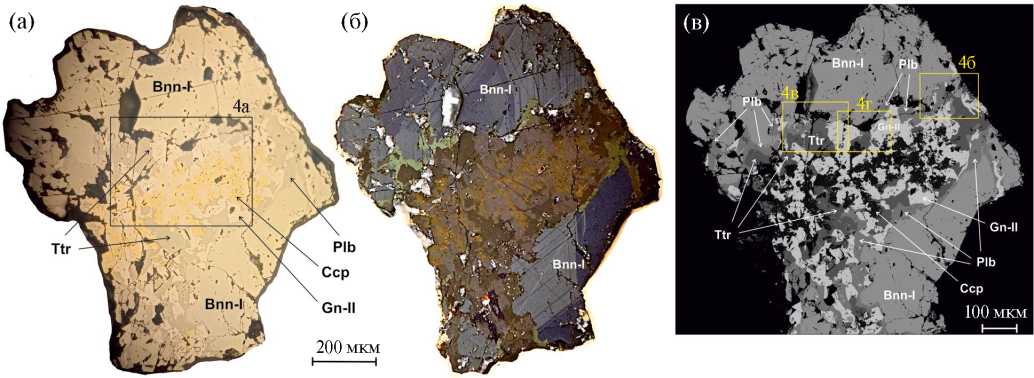 Рис. 3. Зерно из монофракции FMM_FN1086 (образец FMM_1_74896, Кон-Дара, Таджикистан), в котором был обнаружен Ag-содержащий тетраэдрит-(Cd). (а) Бурнонит-I (Bnn) замещается агрегатом, сложенным галенитом-II (Gn), халькопиритом (Ccp), тетраэдритом (Ttr), полибазитом (Plb) и бурнонитом-II. Фрагмент прожилка, подобного тем, которые представлены на рис. 2. Изображение в отражённом свете; (б) То же в скрещенных николях. В бурноните-I проявлено полисинтетическое двойникование; (в) То же в обратно-рассеянных электронах (BSE). Центральная часть прожилка сложена галенитом и приуроченным к нему халькопиритом. Тетраэдрит выполняет интерстиции между зёрнами галенита и халькопирита, тяготея к периферийной части прожилка. Полибазит развит вдоль контакта тетраэдрита (и/или галенита-II) и бурнонита-I