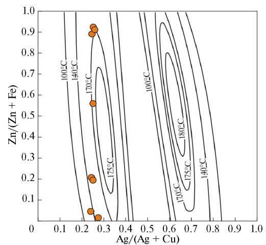 С помощью геотермометра для Аg-содержащих блеклых руд ([25], приложение 5) путём нанесения на график Ag/(Ag+Cu) vs Zn/(Zn+Fe) составов тетраэдрита-(Fe) и тетраэдрита-(Zn) оценены вероятные температуры их отложения (рис. 5). Наиболее высокотемпературным оказался тетраэдрит-(Zn): он мог отложиться при температуре 170 ± 20°С. Затем, при падении температуры до 140 ± 20°С, кристаллизовался тетраэдрит-(Fe). Как было сказано ранее, тесные срастания тетраэдрита-(Fe) и тетраэдрита-(Zn) с тетраэдритом-(Cd), обнаруженные в тончайших прожилках, позволяют предполагать, что тетраэдрит-(Cd) отлагался из того же флюида и при одинаковых условиях, что и тетраэдрит-(Fe) с тетраэдритом-(Zn). Следовательно, кристаллизация тетраэдрита-(Cd) на месторождении Кон-Дара происходила в интервале температур (170-140) ± 20°С.