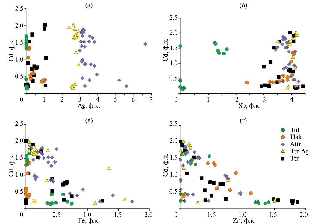 Рассмотрение совокупности анализов (n = 101) не выявило каких-либо чётких взаимосвязей содержаний кадмия с тем или иным элементом в химическом составе Cd-содержащих блёклых руд (рис. 7). Тем не менее, некоторые особенности их состава проявляются. Среди блёклых руд наиболее обогащённым кадмием минералом (до 2.02 ф.к. или 12.31 мас. % Cd) является тетраэдрит, чуть меньшие содержания Cd (1.88 ф.к. или 11.15 мас. %) встречены в аргентотетраэдрите, ещё меньше (1.68 ф.к. или 11.79 мас. %) – в теннантите, а всех меньше, содержание Cd в хаките – не превышает 1.36 ф.к. или 6.55 мас. % (приложение 3, 4 и ссылки там).