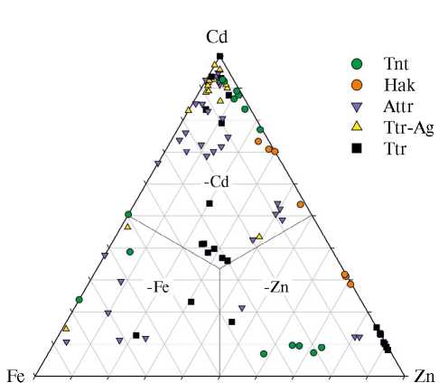 Тройная диаграмма распределения двухвалентных металлов, построенная по всем известным в природе Cd-содержащим блёклым рудам, демонстрирует относительно небольшое количество анализов в центральной её части (рис. 8). Это говорит о том, что промежуточные Cd–Zn–Fe-содержащие блёклые руды крайне редки. Они обнаружены только на месторождении Barquilla в Испании. Приведённые данные могут свидетельствовать о наличии разрывов смесимости в Cd–Zn–Fe-содержащем теннантиттетраэдритовом твёрдом растворе. Разрыв смесимости может быть обусловлен низкими температурами образования Cd-содержащих блёклых руд (< 200°C), при которых имеет место распад блёклорудного твёрдого раствора на крайние Fe-, Zn- и Cd-члены, либо может быть связан с определёнными физико-химическими условиями кристаллизации Cd–Zn–Fe-содержащих блёклых руд и составом минералообразующего флюида.