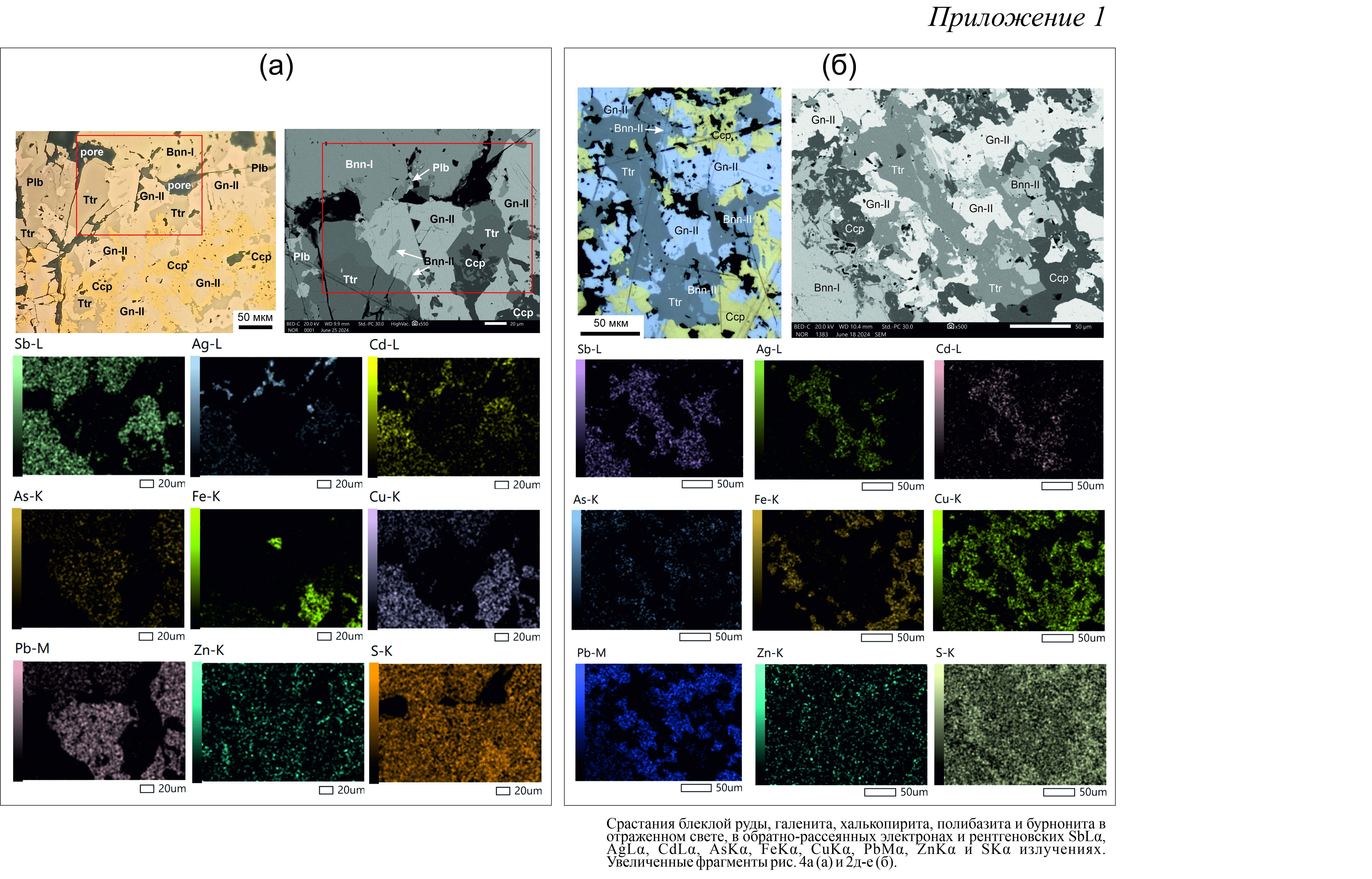 На картинах распределения элементов в характеристических лучах видно, что Cd сосредоточен главным образом в блёклой руде: контуры выделений блёклой руды, а также аномалий по Ag и Sb, совпадают с контурами высоких концентраций Cd (Приложение 1).