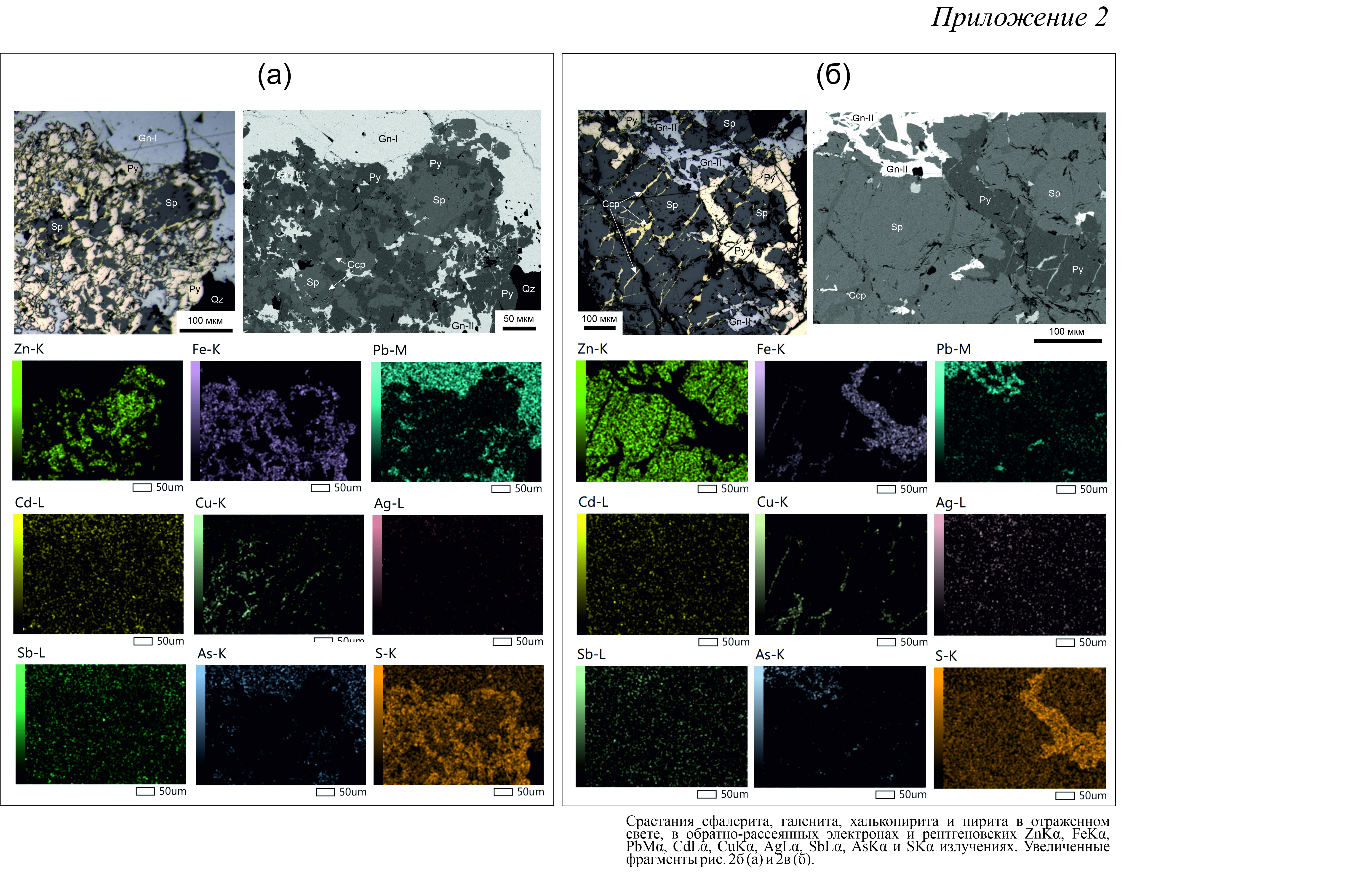Сфалерит по данным 6 анализов содержит невысокие концентрации Fe и Cd. Его усреднённый состав (мас. %): Zn 65.32, Fe 1.02, Cd 0.32, Cu 0.15, In 0.07 и S 32.67 (табл. 1–2, ан. 27–28). Низкие концентрации Cd и Fe в сфалерите также подтверждаются картинами распределения элементов в характеристических лучах (приложение 2).