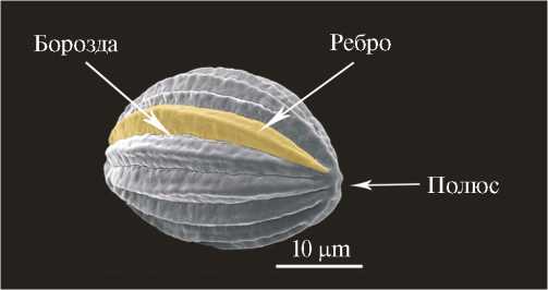 Пыльцевое зерно эфедры имеет, как правило, удлинённую эллипсоидальную форму, в экваториальной проекции очертание зёрен овальное или округлое, в полярной проекции – округлое [13]. Размер зёрен изменяется от 10 до 80 мкм по длинной оси [14]. Пыльца имеет борозды и рёбра (от 4–20), сходящиеся у полюсов (рис. 2).