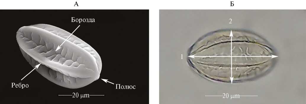 Рис. 3. Внешний вид пыльцевого зерна эфедры даурской (Ephedra dahurica Turcz). А – Пыльцевое зерно под электронным микроскопом; Б – Пыльцевое зерно под световым микроскопом. 1 – экваториальный диаметр (ЭД); 2 – полярная ось (ПО)