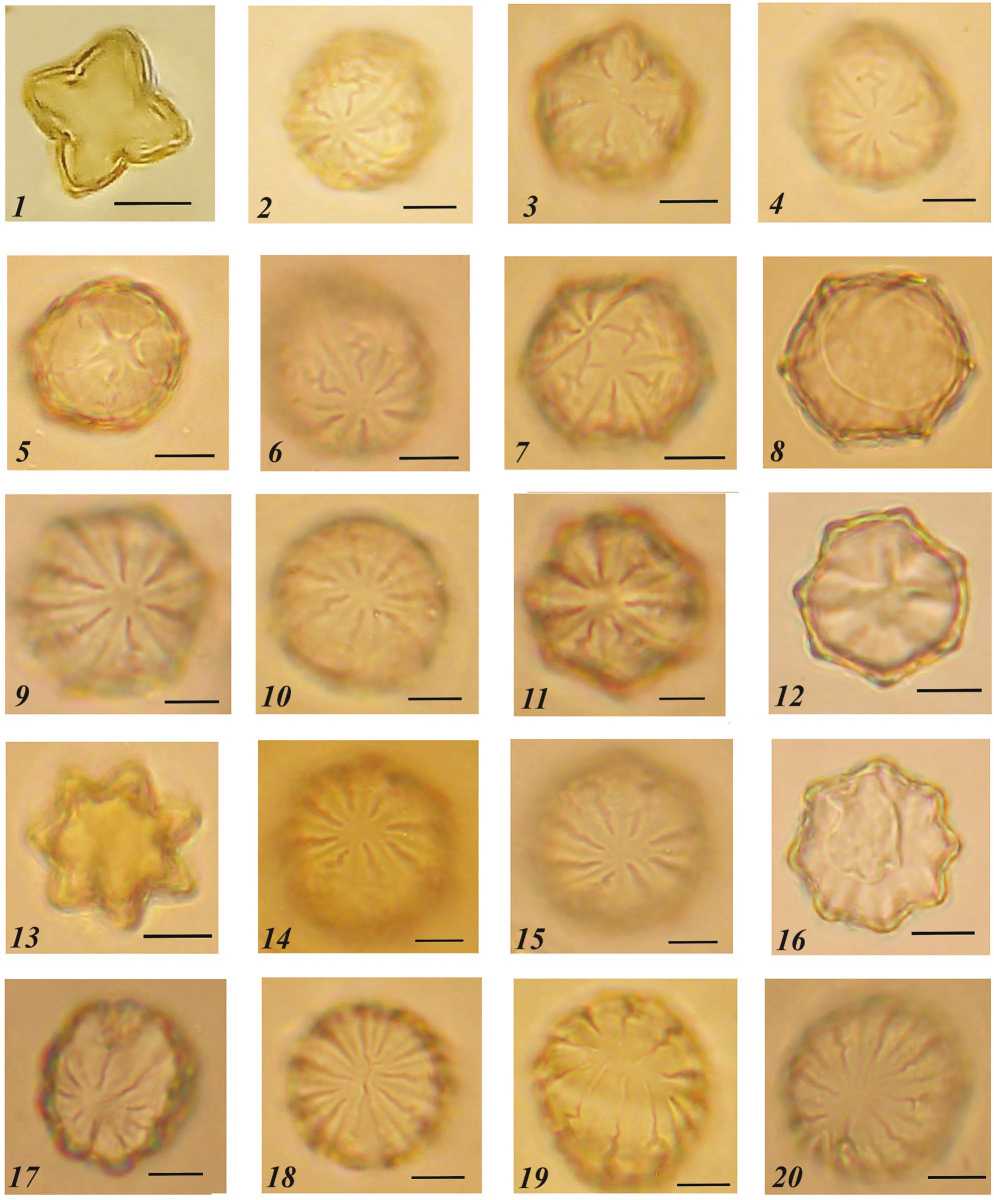 Рис. 4. Пыльцевые зерна эфедры даурской Ephedra dahurica. Вид с полюса. Масштабная линия соответствует 10 мкм. 1 – четырех-бороздное; 2, 3, 5 – пяти-бороздное; 4, 6–9 – шести-бороздное; 10–13 – семи-бороздное; 14–16 – восьми-бороздное; 17 – девяти-бороздное; 18, 19 – десяти-бороздное; 20 – шестнадцати(?)-бороздное