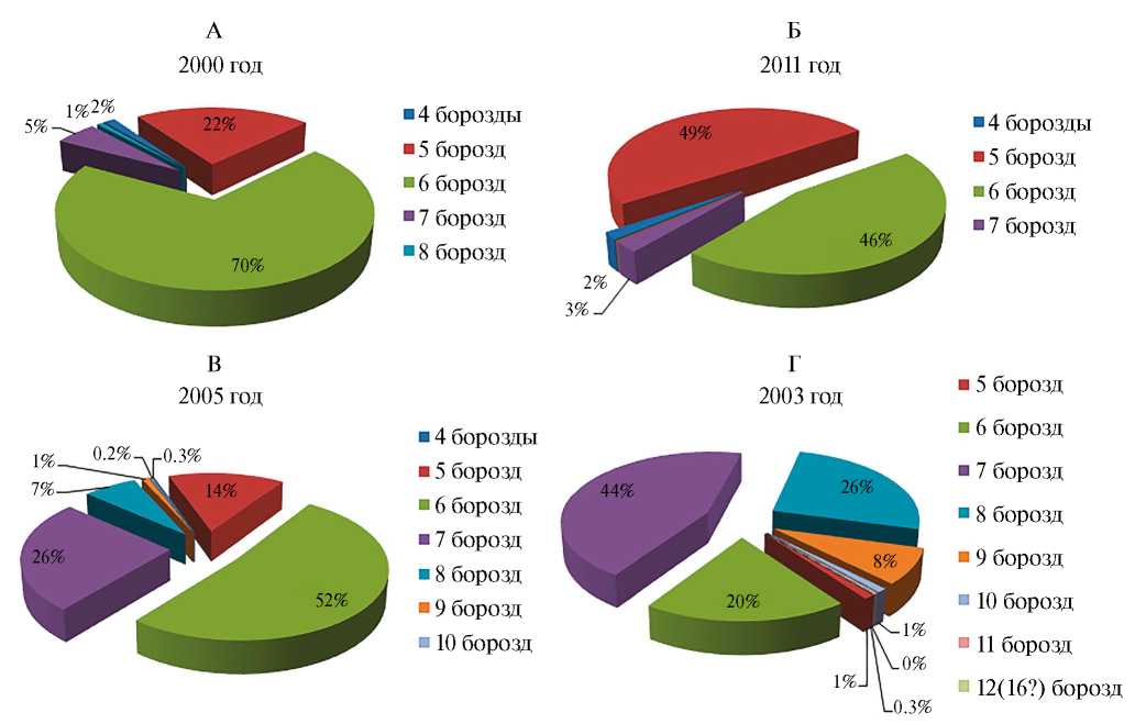 В образцах пыльцы 2000 и 2011 года установленное количество борозд изменялось от 4 до 8, рис. 4 (1‒16). В их пыльниках преобладали пятии шести-бороздные зёрна, рис. 5А, Б. Совсем незначительную долю составляла пыльца с 4, 7, и 8 бороздами. В образцах 2003 и 2005 увеличивается количество семии восьми-бороздной пыльцы, появляется пыльца с 9–12 бороздами, рис. 5В, Г. В образце этого года не было обнаружено четырёх-бороздной пыльцы.