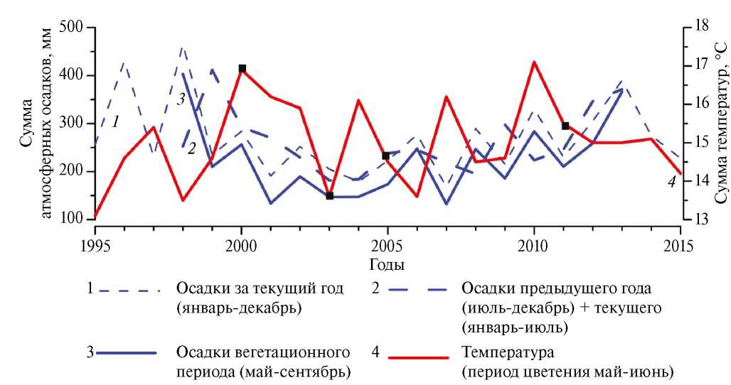 Анализ климатических параметров территории произрастания растения показал, что 2000 год характеризовался высокими значениями среднегодовой суммы атмосферных осадков. Интересно, что и сумма осадков предыдущего года также была высокой (рис. 6). Сумма осадков вегетационного периода 2000 года и температуры воздуха в период цветения также были высокими.