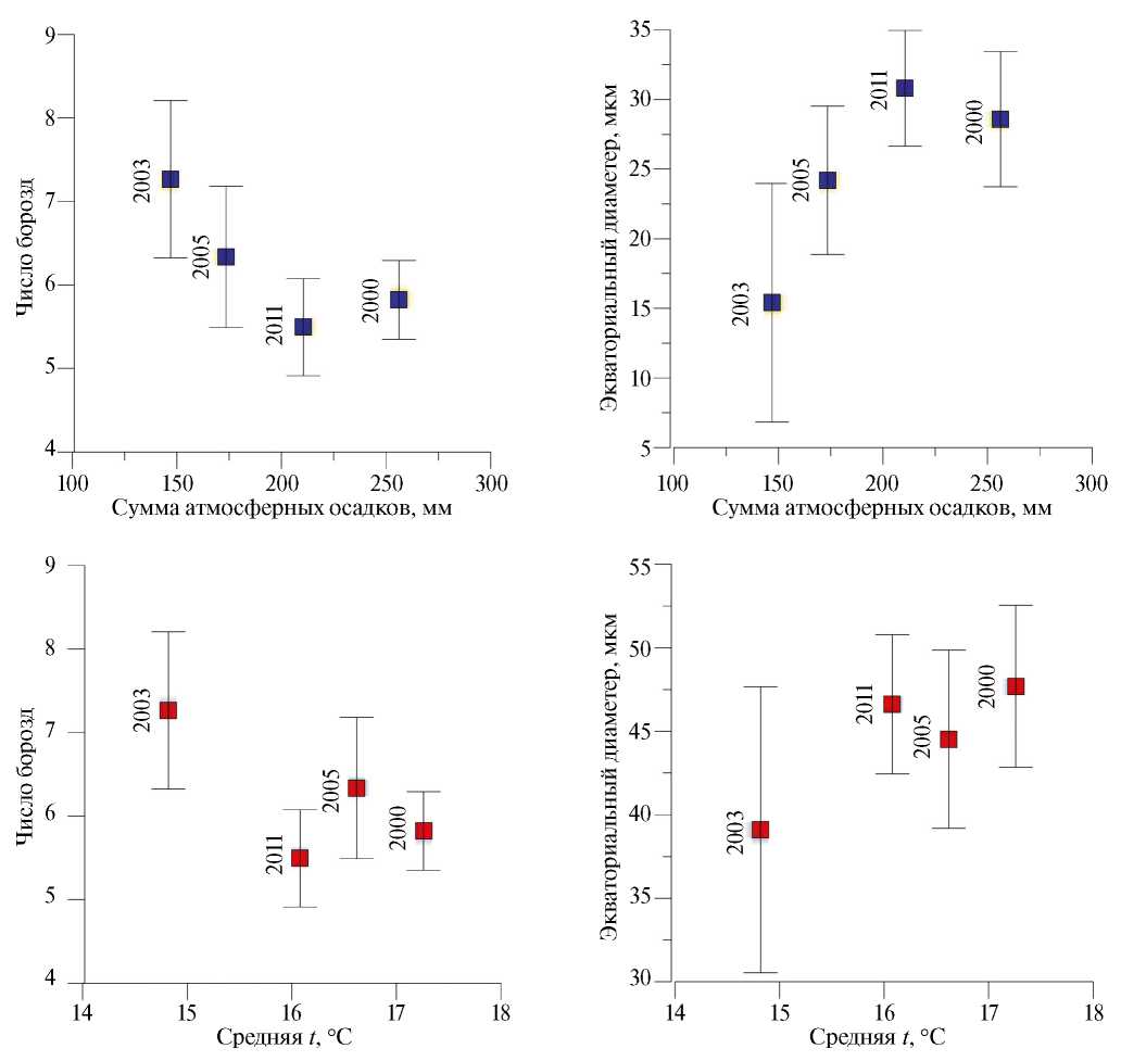 Рис. 7. Графики корреляции количества борозд у пыльцы Ephedra dahurica Turcz. с атмосферными осадками вегетационного периода (май–сентябрь) и температурой воздуха периода цветения (май–июнь)