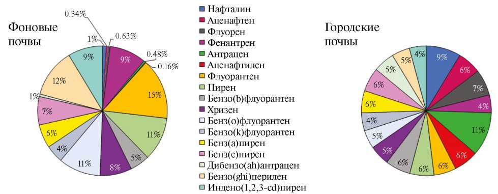 Состав ПАУ в фоновых почвах и в почвенном покрове Улан-Удэ показан в табл. 1 и на рис. 1. Сумма ПАУ в фоновых почвах составляет 93.6 нг/г, что близко к значениям, полученным для фоновых почв Тюмени (114 нг/г) и Северобайкальска (110 нг/г) [14, 15]. Наиболее высокие доли в фоновых почвах наблюдаются у среднеи высокомолекулярных флуорантена, бензо(ghi)-перилена, пирена, бензо(b)флуорантена, индено(1,2,3-cd)пирена и низкомолекулярного фенантрена. У остальных 2‒3-ядерных ПАУ доля не превышает 1%.