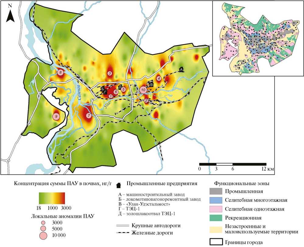 Степень контрастности техногенных аномалий ПАУ в городских почвах определялась по коэффициентам концентрации Кс = Ci/Cф, где Ci и Сф – содержание i-го ПАУ в городских и фоновых почвах соответственно. Основные источники полиаренов и их вклад в загрязнение верхних горизонтов городских почв оценивались на основе анализа главных компонент в пакете Statistica 12.0 и расчёта парных диагностических соотношений ПАУ. Карта суммарного содержания ПАУ в почвах Улан-Удэ составлена в пакете ArcGIS 10.3 путём интерполяции методом ОВР, распределение суммы ПАУ показано цветовым фоном. Из-за наличия экстремальных значений, в десятки раз превосходящих средние, локальные экстремумы изображены на карте пунсонами разного размера.