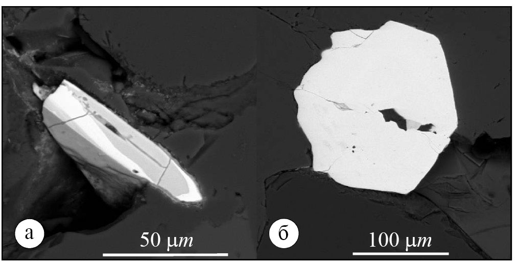 Рис. 1. Изображения типичных зерен ряда колумбит-(Fe) – танталит-(Fe) (а) и тапиолита (б), обратно-отраженные электроны.
