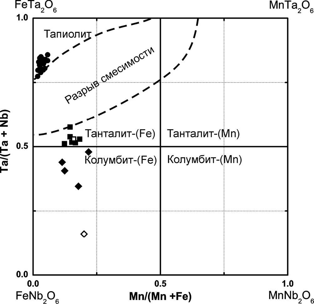 Рис. 2. Дискриминационная диаграмма для минералов ряда колумбит–танталит–тапиолит по [15]. Кружки – тапиолит, квадраты – танталит, ромбы ‒ колумбит. Незакрашенные значки – усредненные составы, полученные для внутренней и внешней зоны зерна на рис. 1 а.