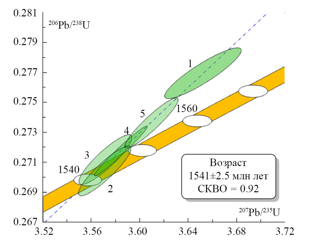 Отношения 206Pb/204Pb в пяти проанализированных навесках колумбита-(Fe) – танталита-(Fe) и тапиолита находятся в пределах от 105 до 6683. Фигуративные точки располагаются на конкордии и вблизи нее. Рассчитанная по пяти точкам дискордия определяет возраст 1541±2.5 млн лет (СКВО = 0.9).