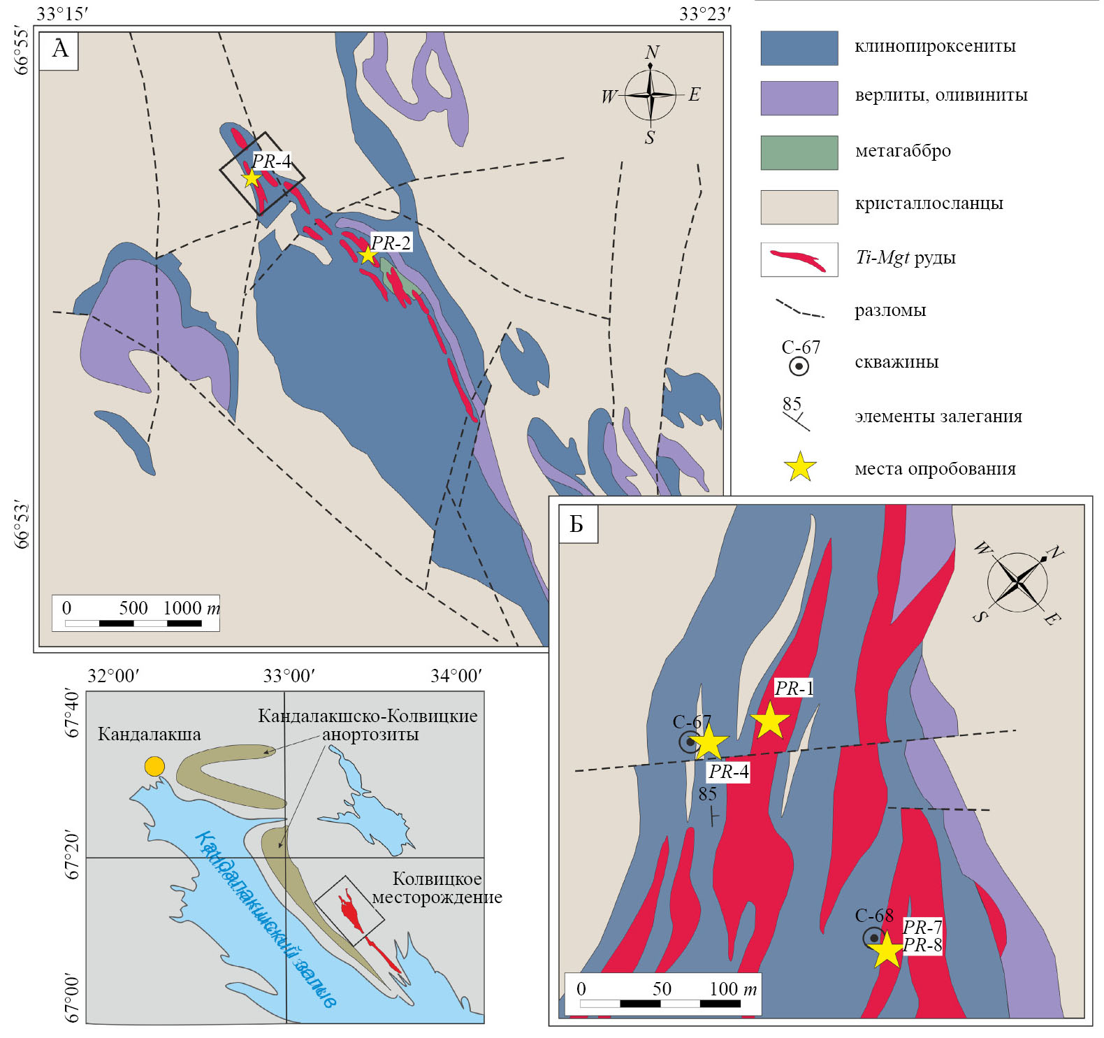 Колвицкое Fe–Ti–V-месторождение (рис. 1) расположено в массиве Железный, входящем в состав порьегубского клинопироксенит-верлитового комплекса. Этот комплекс образует в структуре Кандалакшско-Колвицких гранулитов цепь массивов общей протяженностью более 20 км, ориентированную в северо-западном направлении [7–9]. Массив Железный размером 4 × 1 км сложен преимущественно клинопироксенитами (рис. 1). Подчиненная группа пород массива Железный представлена верлитами, оливинитами, вебстеритами, оливиновыми клинопироксенитами и титаномагнетитовыми рудами (магнетититами) [10] и рассматривается исследователями как позднее образование (поздняя фаза) массива [11].