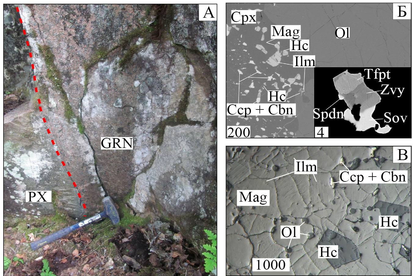 Рис. 2. (А) Фотография обнажения резкого контакта (выделено красным пунктиром) ксенолита гранулитов (GRN) и закаленных клинопироксенитов (PX) массива Железный. Длина кувалды 40 см. (Б) BSE-изображение минерализованного оливинового пироксенита, содержащего минералы платиновых металлов (на врезке). (В) Микрофотография титаномагнетитовой руды Колвицкого месторождения в отраженном свете. Масштабные линии – в мкм. Ссp – халькопирит, Cbn – кубанит, Cpx – клинопироксен, Hc – герцинит, Ilm – ильменит, Mag – магнетит, Ol – оливин, Sov – соболевскит, Spdn – станнопалладинит, Tfpt – тетраферроплатина, Zvy – звягинцевит.