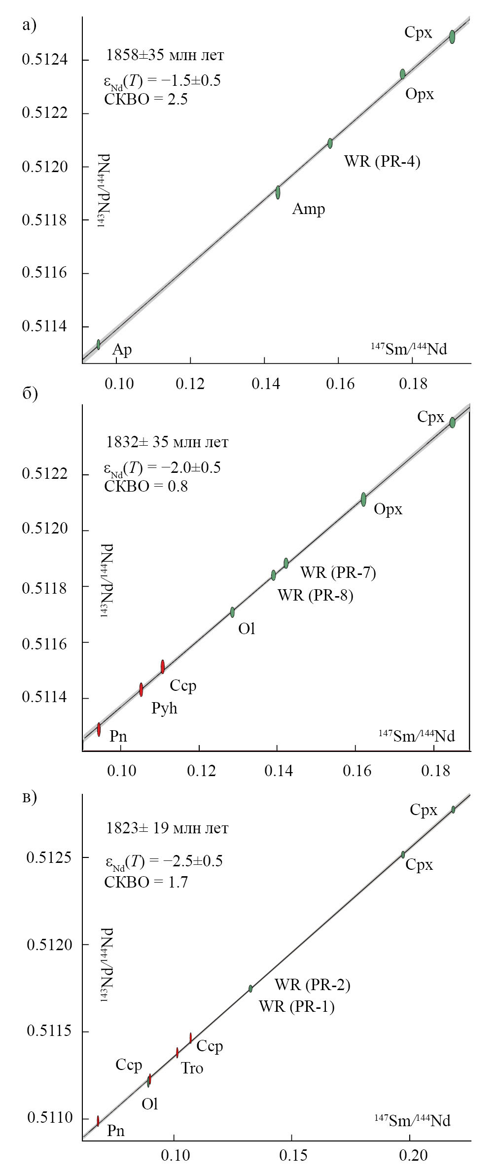 Рис. 3. Минеральные Sm–Nd-изохроны для пород и руд массива Железный: а) безрудные клинопироксениты; б) минерализованные пироксениты; в) титаномагнетитовая руда. WR – порода в целом, Cpx – клинопироксен, Opx – ортопироксен, Ol – оливин, Amp – амфибол, Ap – апатит, Ccp – халькопирит, Pyh – пирротин, Tro – троилит, Pn – пентландит. Красными эллипсами обозначены сульфидные минералы.