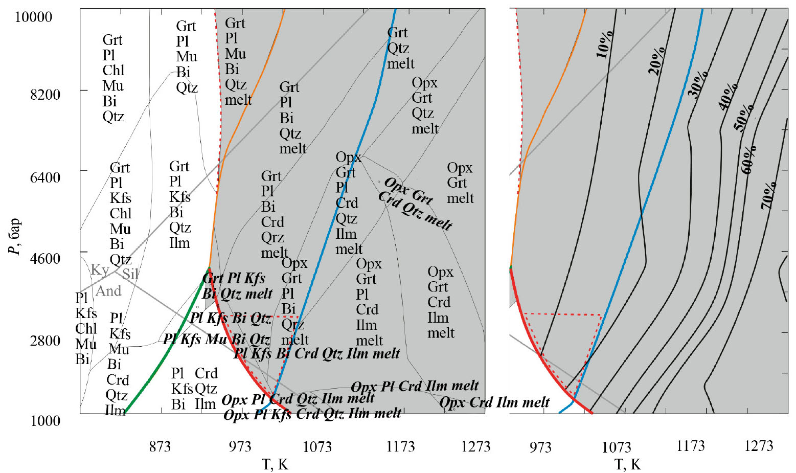 Рис. 1. Расчетная фазовая диаграмма для валового состава, соответствующего верхней континентальной коре (UCC)+5 мас. % Н2О. Поля с содержанием фаз менее 1% не показаны. Красная и синяя кривые ограничивают поля устойчивости мусковита и биотита. Серым цветом выделена область существования гранитного расплава. На правом рисунке показан фрагмент с линиями постоянной степени плавления (мас. % расплава). Поле, где расплав сосуществует с субликвидусными твердыми фазами, выделено на рис. 1 серым цветом. Его низкотемпературная граница практически совпадает с линией разложения мусковита (Ms, оранжевая кривая на рис. 1) . А синяя кривая соответствует линии разложения биотита (Bt). Поскольку эти два минерала являются главными концентраторами Sn в низко- и среднетемпературных породах, их полное разложение должно благоприятствовать накоплению Sn в расплаве.