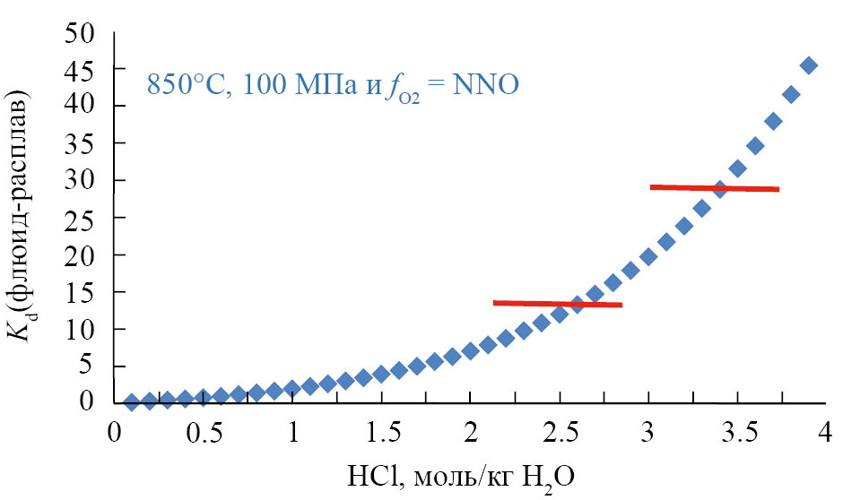 Рис. 2. Зависимость коэффициента разделения Sn между флюидом и гранитным расплавом (Kd) от содержания HCl во флюиде при летучести кислорода (fO2), соответствующей буферу Ni-NiO (по экспериментальным данным [15]). Красными отрезками показан диапазон значений Kd, согласующийся с оценками по флюидным включениям.