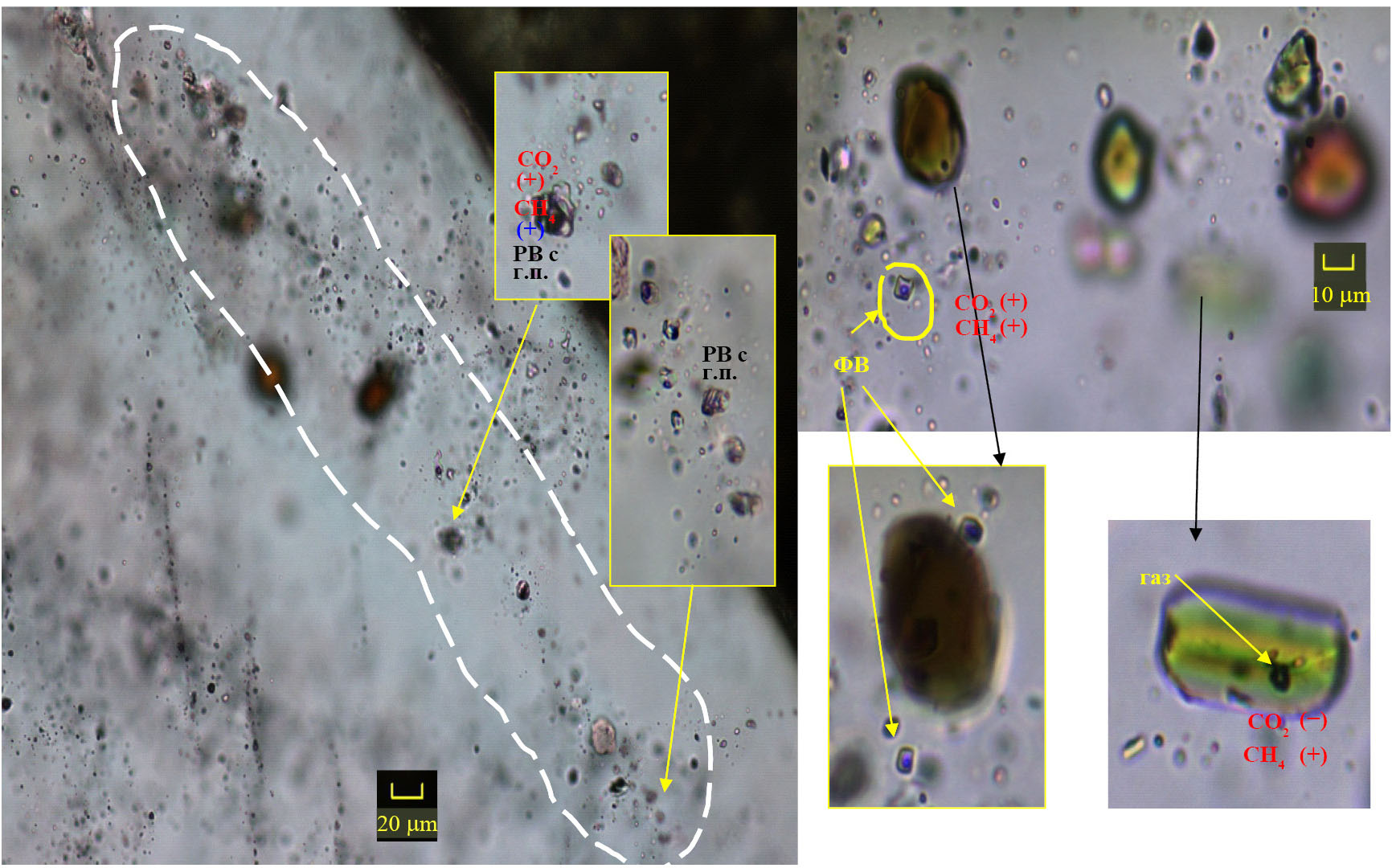 Рис. 3. Примеры расплавных (слева) и флюидных (справа) включений в кварце месторождения Тигриное [6, 8]. Обратите внимание, что во флюидных включениях присутствуют СО2 и СН4.