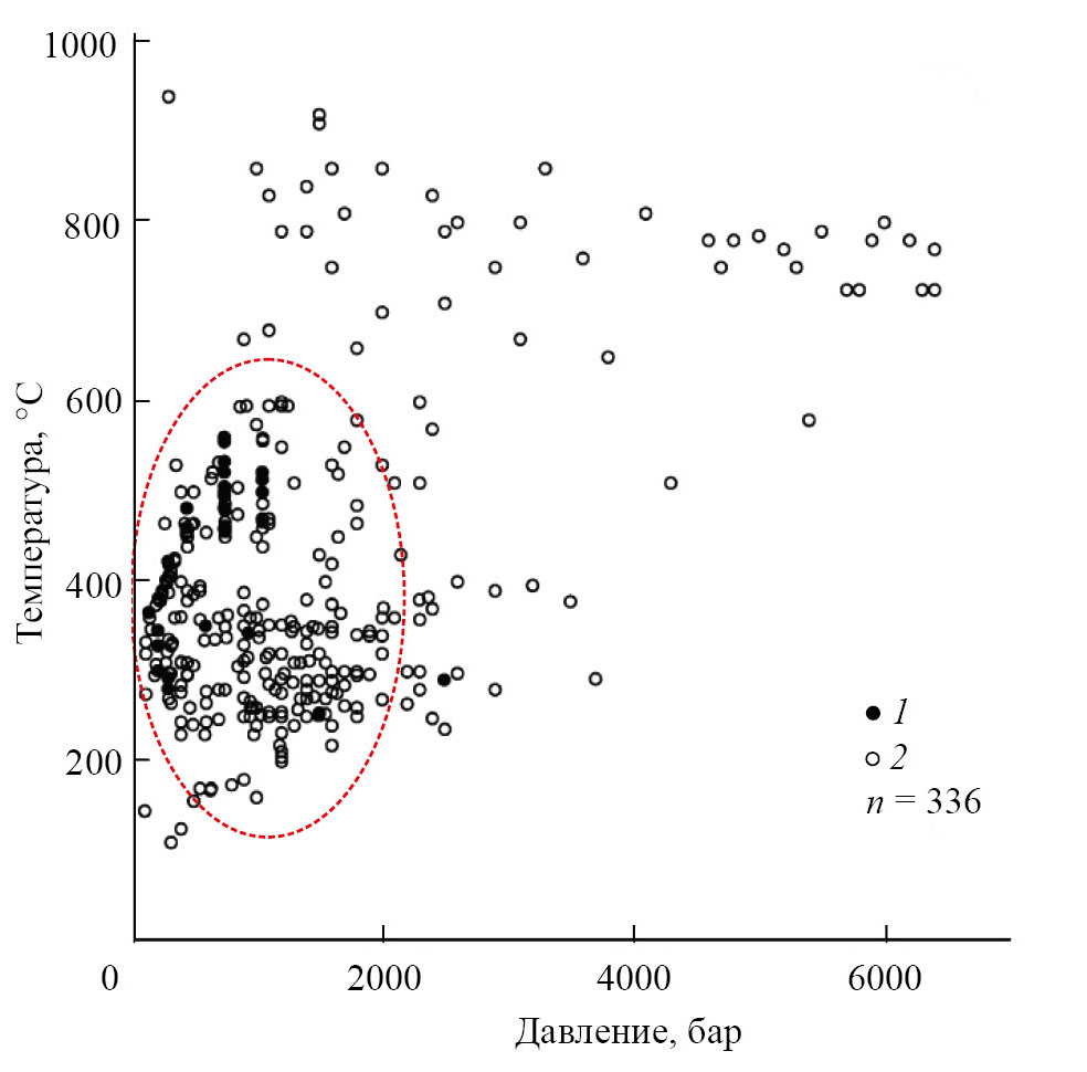 В работе [5] приведены также статистические данные по оценкам температуры гомогенизации (T°С) и давления(P, бар) захвата флюидных включений в кварце и касситерите рудных жил оловянно-вольфрамовых месторождений. Наиболее часто встречаемые значения соответствуют интервалам 330–450° и 500–1500 бар (рис. 5).