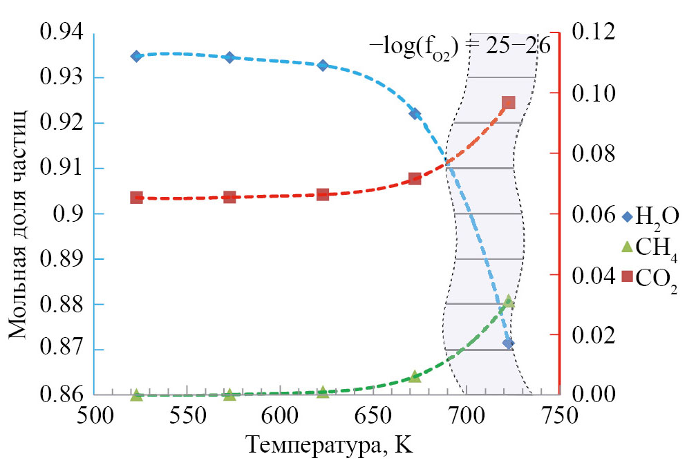 Рис. 6. Зависимость состава флюида системы С-О-Н от температуры (Р = 1000 бар). Синяя шкала ординат – содержание Н2О, красная – СО2 и СН4. Серым выделена область составов при значениях летучести кислорода 10–25–26, в которой отношение СН4/CO2 близко к среднему для оловянно-вольфрамовых месторождений.