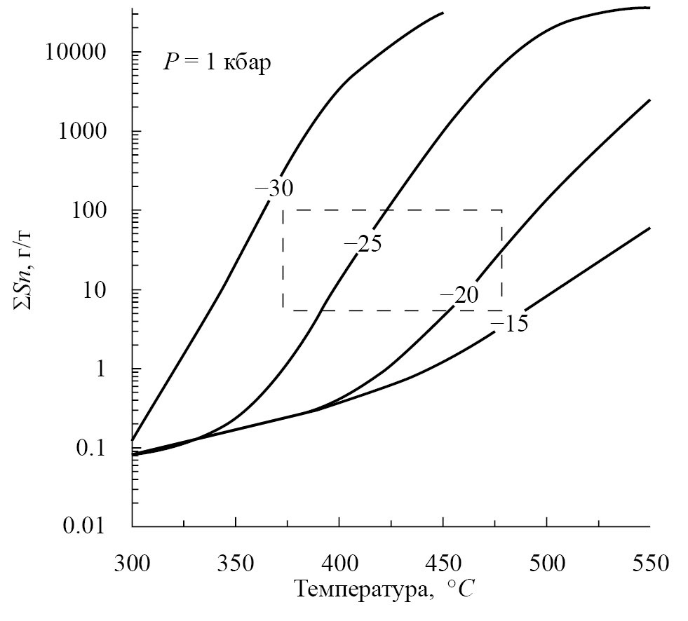 На рис. 7 показаны расчетные кривые растворимости касситерита в растворе KCl в зависимости от температуры и летучести кислорода. Красным прямоугольником на рисунке выделена область значений T, концентрации Sn и fO2, соответствующая данным по составу флюидных включений в кварце и касситерите рудных жил. Эти данные показывают, что отложение касситерита проходило из слабосоленых восстановленных гидротермальных растворов.